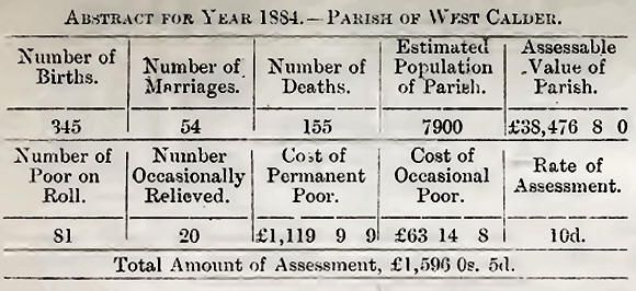 But selfishness and -schism, with their attendant divisions and heartburnings, from one cause and another, crept into the Kirk, which, rent and torn, was unable longer to bear its wonted burden, and, gladly easing itself thereof, threw it upon the grim calculating shoulders of the State, which again delegated its work to the various Parochial Boards, with the result that we of this generation are only too familiar with, better, perhaps, in some respects than formerly, but lacking the true element of real charity, and hence giving birth to the callous proverb which is born of, and may well become, this age of mammon worship “As cold as charity.” For the purpose of comparison with the two following tables, I have been favoured by Mr Thos. Thomson, Inspector for the parish, with a similar abstract for the year 1884.