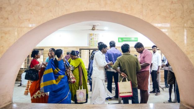 queue of lunch-goers at the amma canteen in Pallavaram town, just