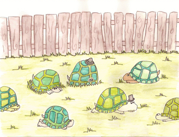the pond one of the tortoises heard a noise. “Stop. I heard something,”