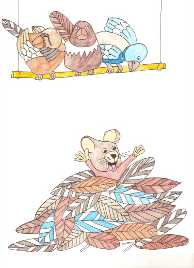 of feathers were stacked high. He jumped inside them. “Whee! Feathers! I
