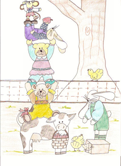 bunnies, two bears, two chicks, a cow, a cat and a mouse all lived