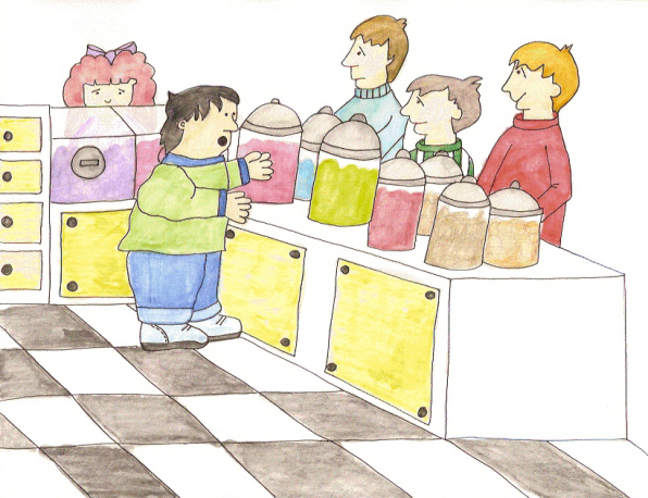 hesitation, Kirsten marched into the sweetie shop. She explained to Mr.