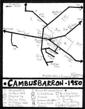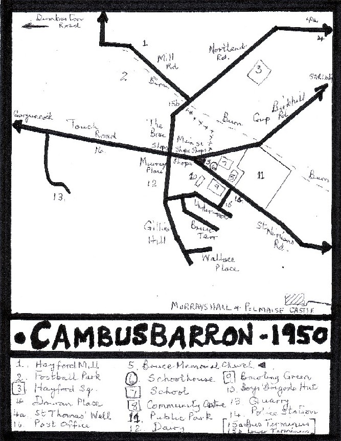 Although my sketch map does scant justice to the novel sights and sounds I first experienced in Cambusbarron in the autumn of 1949, it does suggest the amazing variety of stimuli that became available to my eyes and ears a mere stone’s throw from the front door of our refurbished schoolhouse. This hamlet became my home for the next seven action-packed years … a ‘town’ village that from the word go undoubtedly stood in noisy yet thrilling contrast to the peacefully isolated nature of my previously beloved, but truly rural, Banknock.