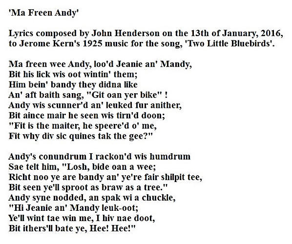 Lyrics composed by John Henderson on the 13th of January 2016 to Jermome Kern's 1925 music for the song, Two Little Bluebirds
