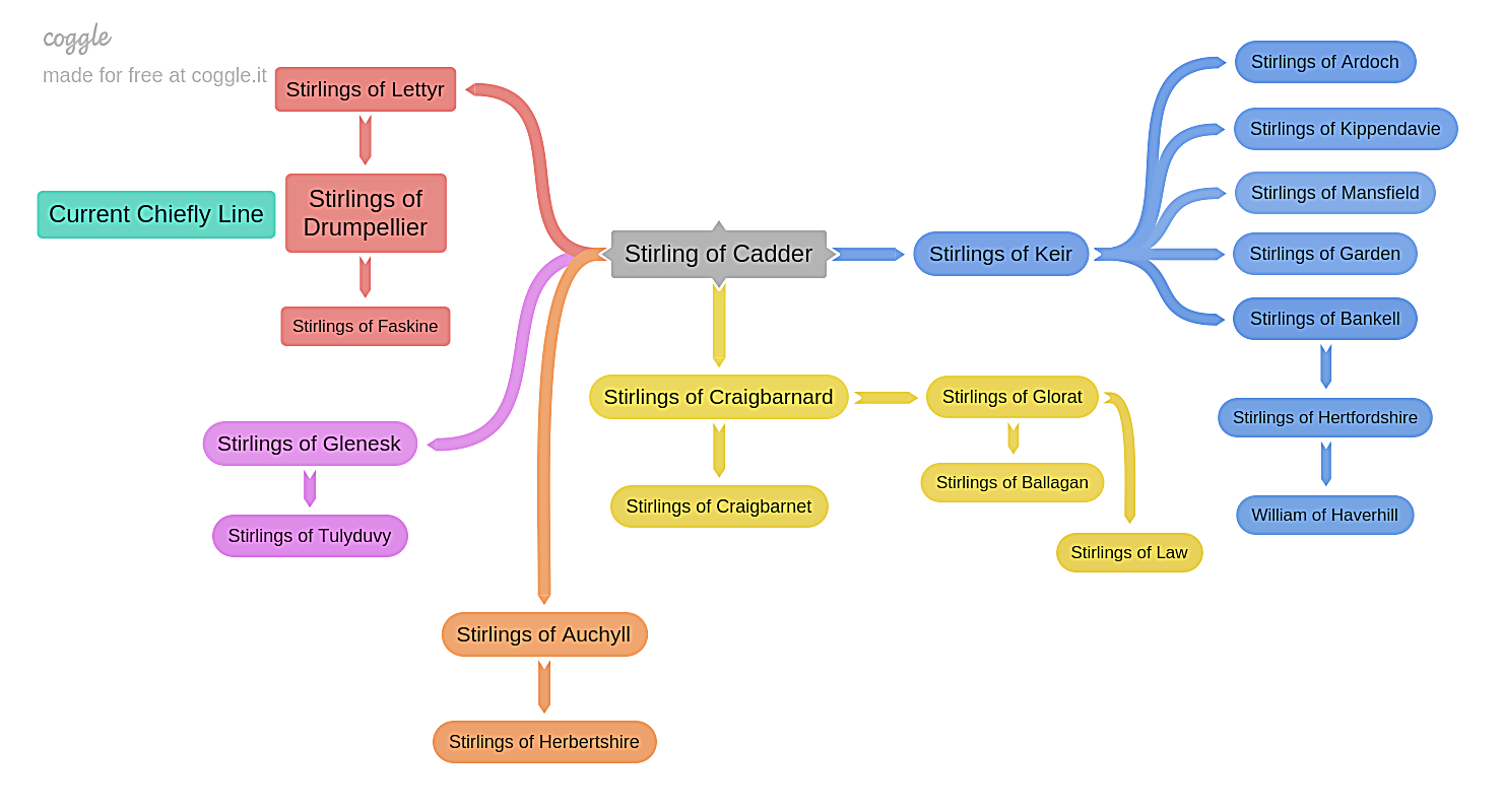 The current chief sent me a copy of the matriculation of the above arms (29 July 1959) in which it is clearly stated by the Lord Lyon that this family were originally MacGregors who took the Stirling surname during the proscription. Hence the Stirling of Keir bend and buckles with the MacGregor charges.