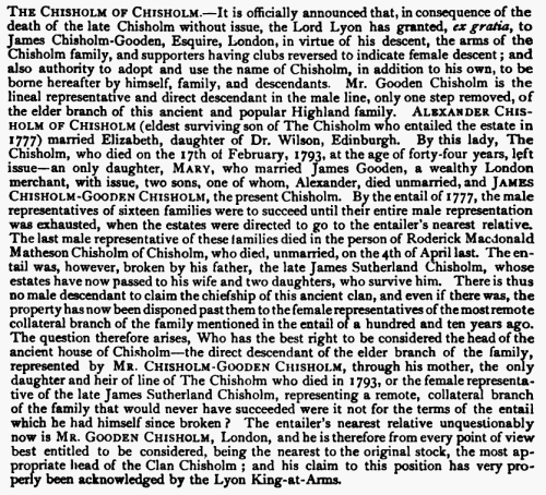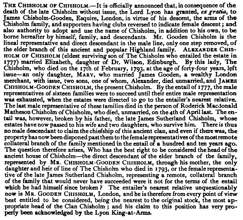 He was succeeded by his brother, Duncan MacDonnell Chisholm, who died in London 14th