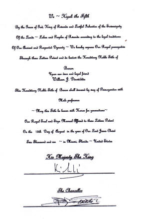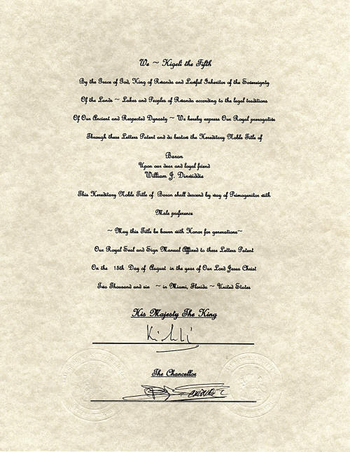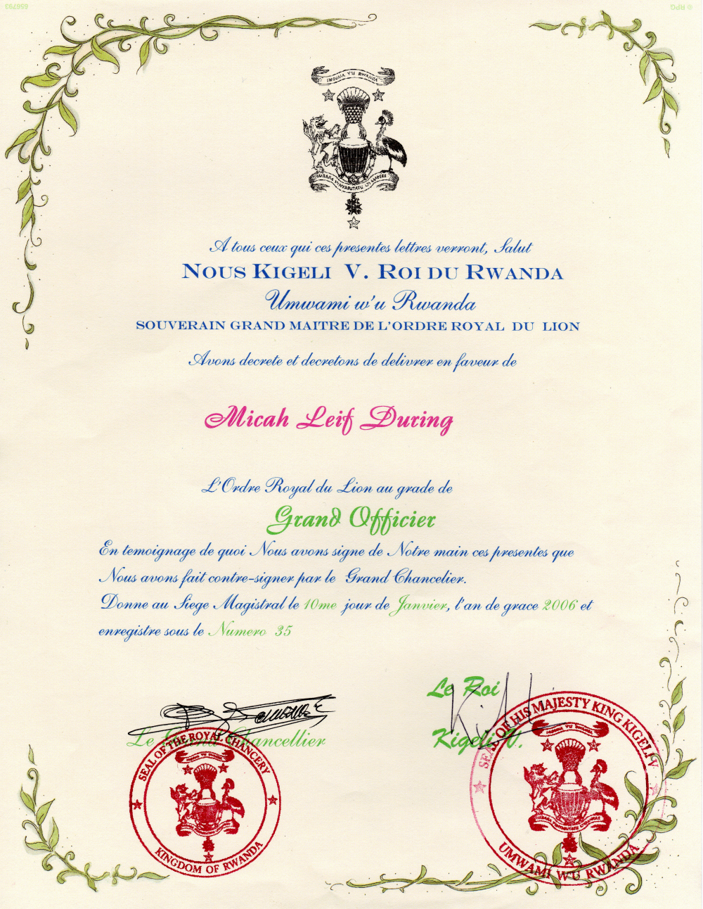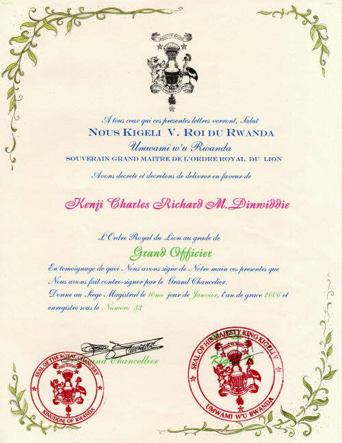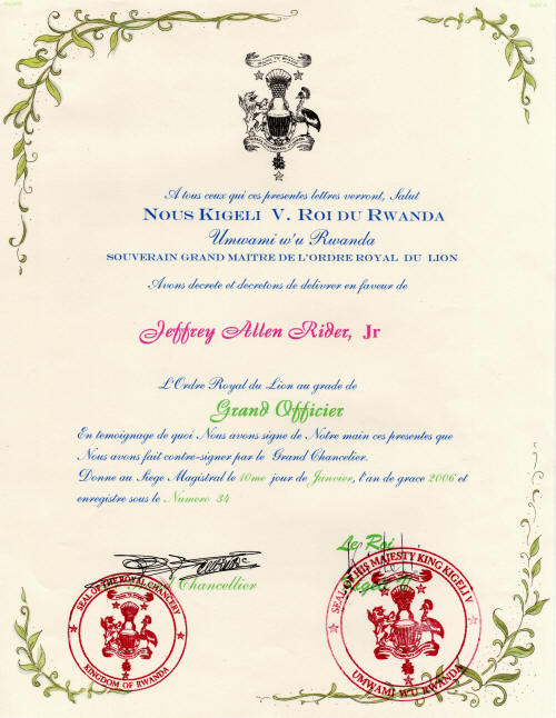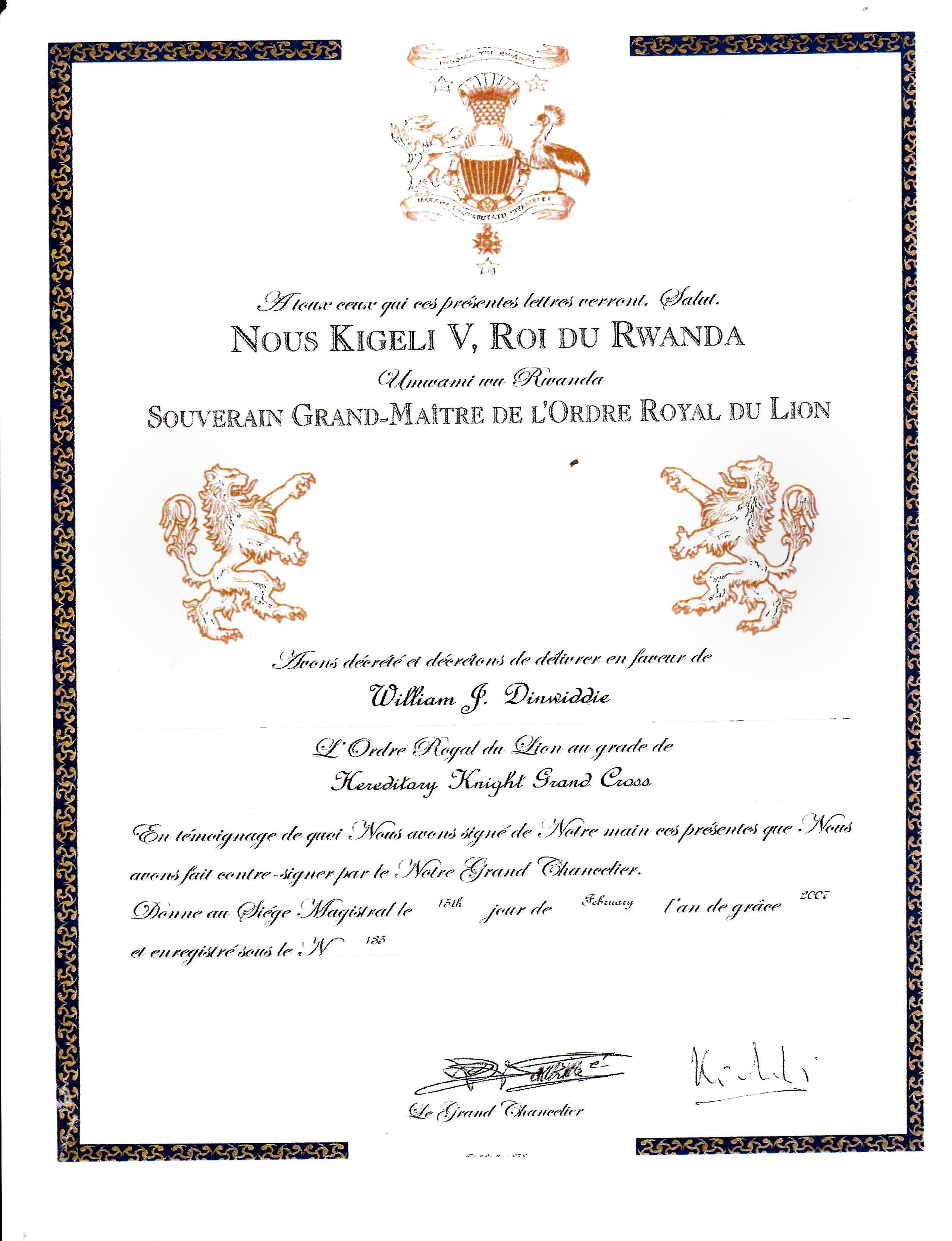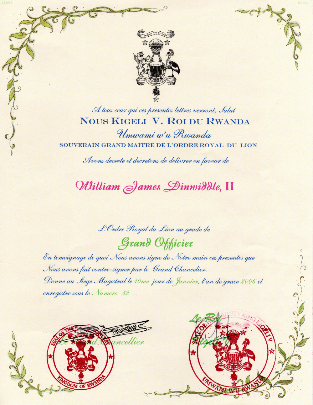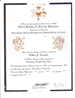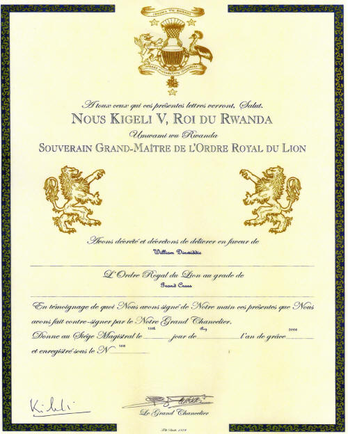 Order of the Lion of Rwanda. Also, a Baron of Rwanda by Kigeli V and