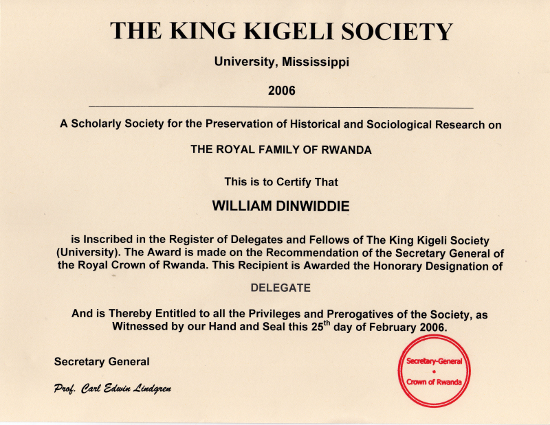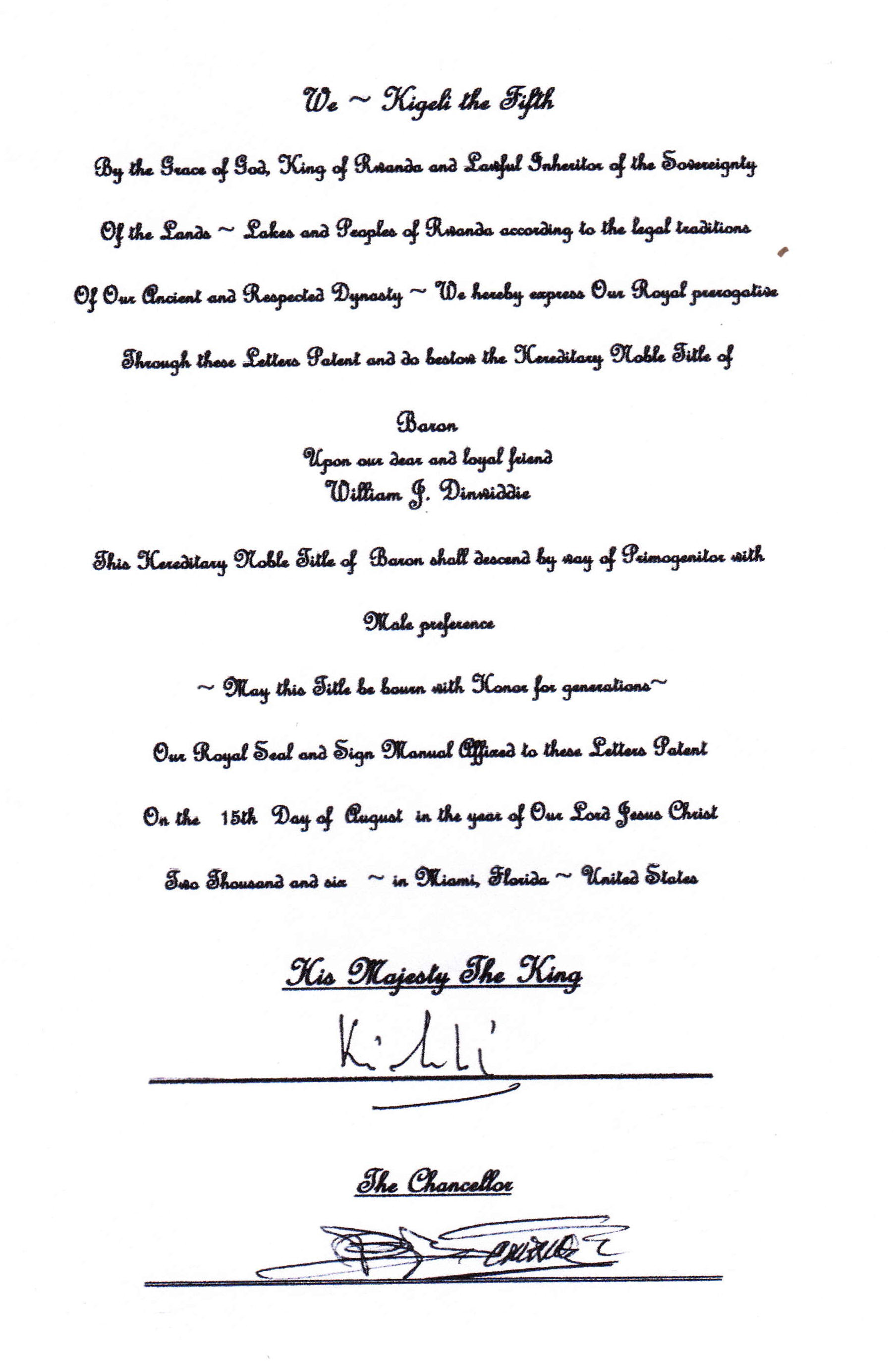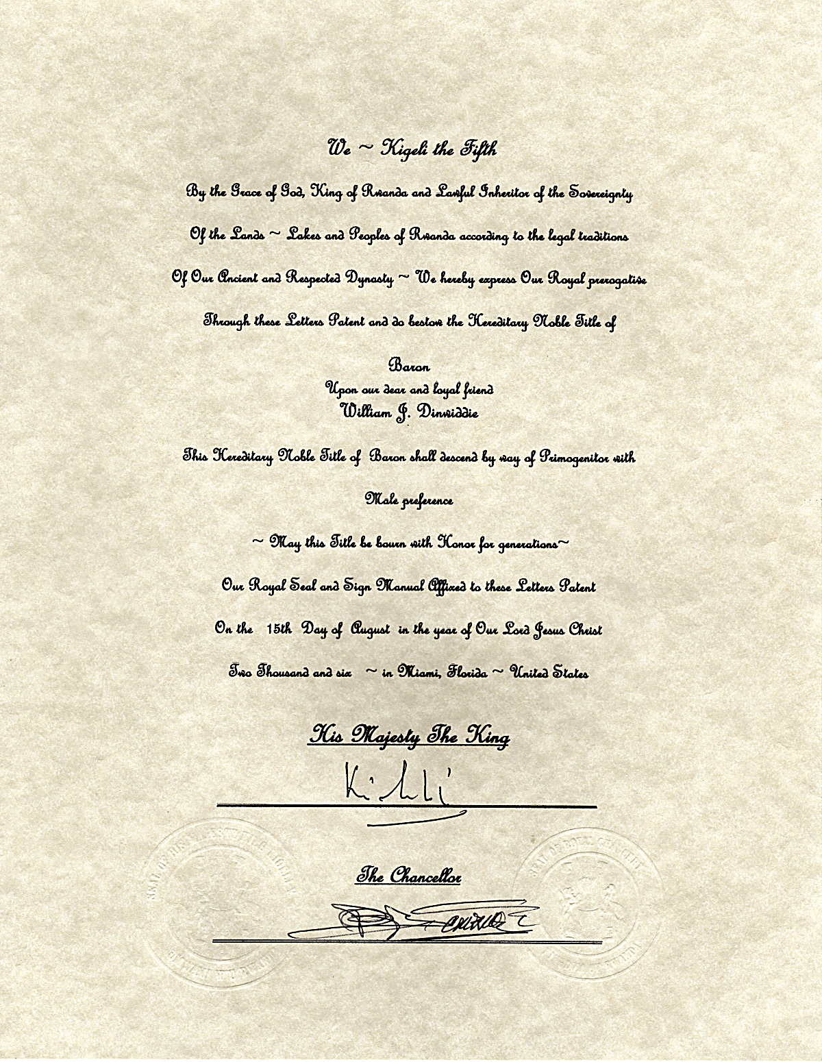 and at my request my sons William James II and Kenji Charles Richard Michael Dinwiddie were knighted by King Kigeli V of Rwanda,