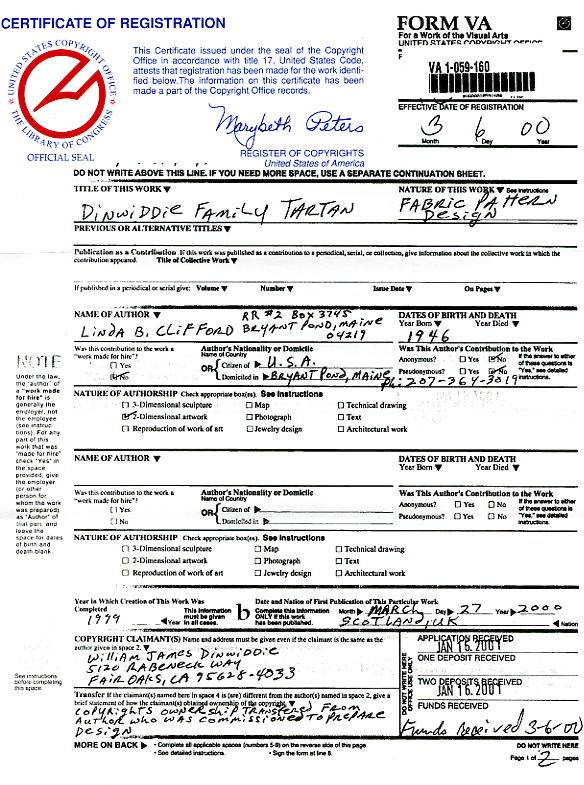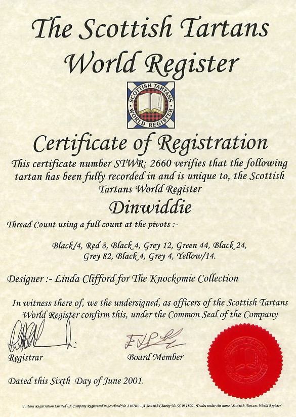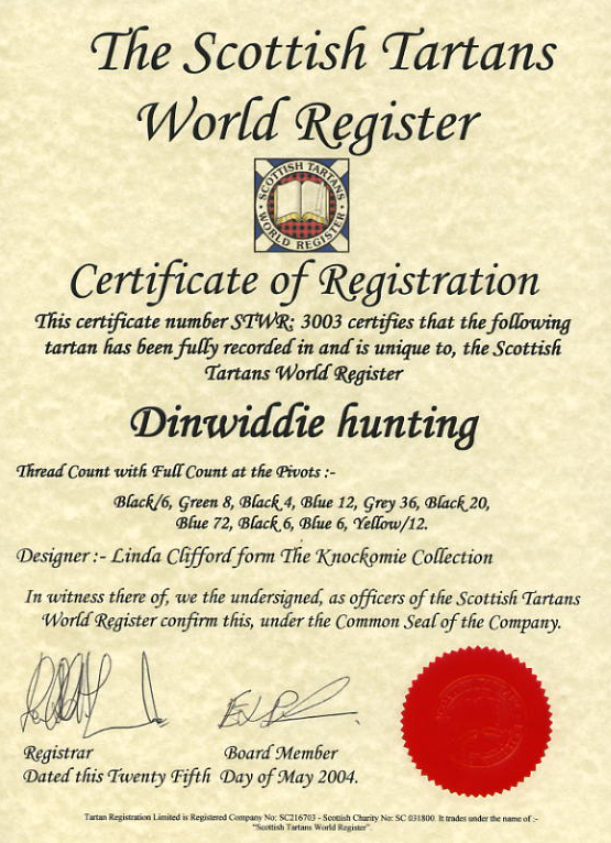 the Dinwiddie Hunting Tartan is fully registered and as with the original I
