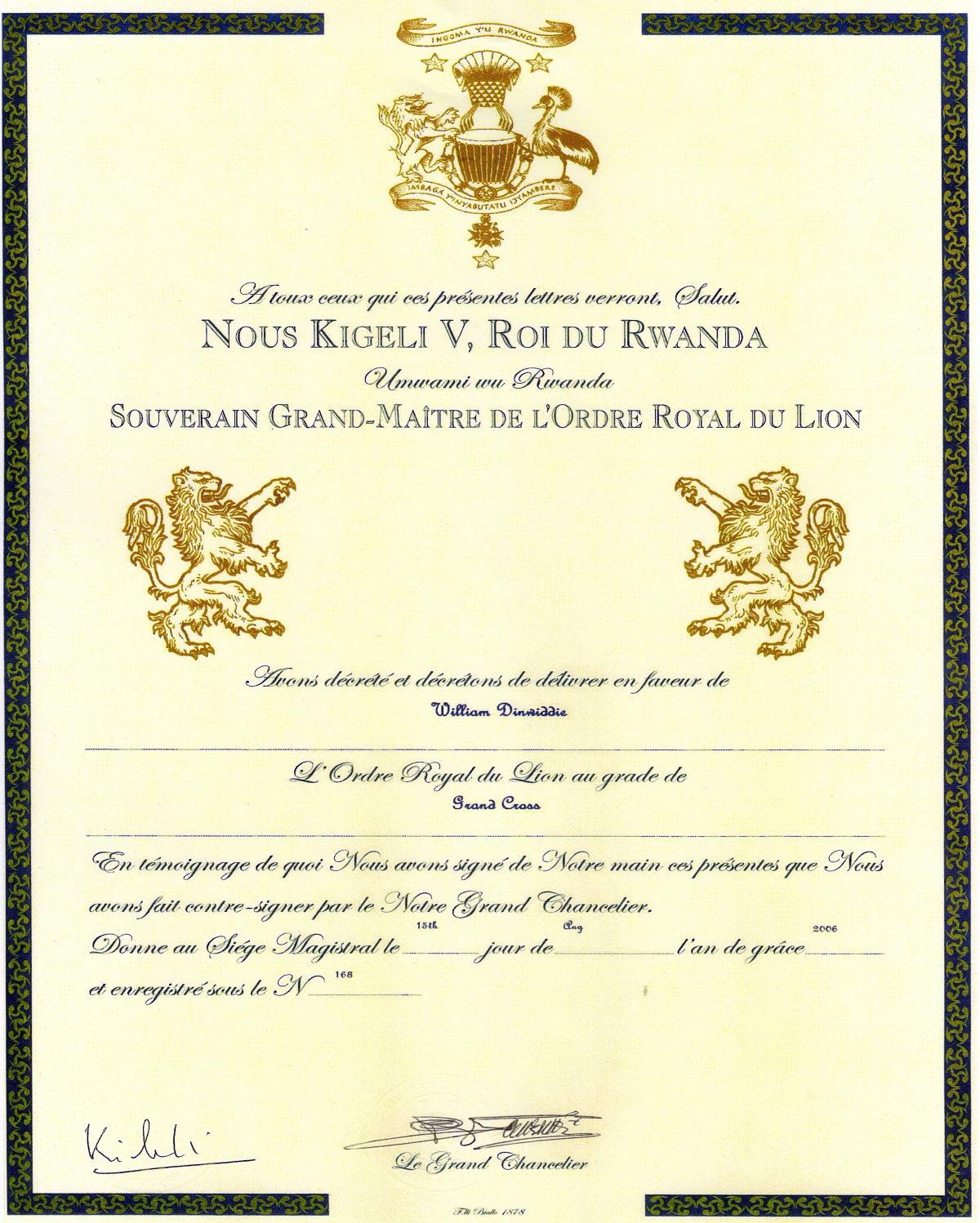 hereditary grand cross in the Royal order of the Lion of Rwanda in 2006.