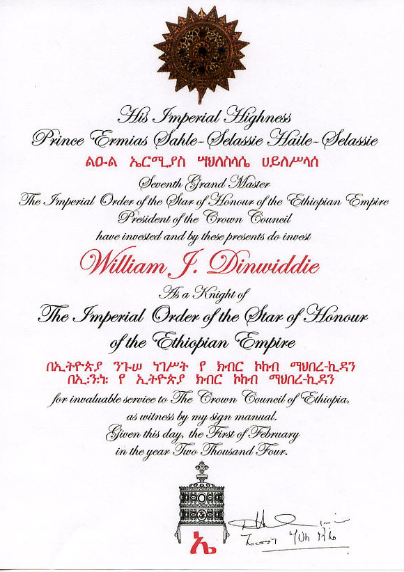 of Honour of the Ethiopian Empire last year at the grade of Knight. I have