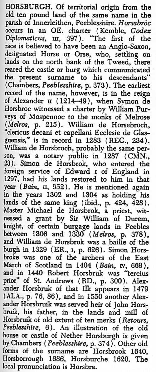 Glasgow in 1287. Alexander Horsbrock of that Ilk is recorded in 1479.