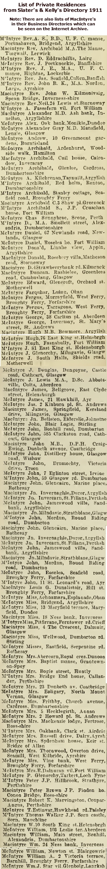While searching the Internet Archive I came across Slater's Directory which provides a number of directories. The graphic below is one I took from the 1911 list of private residences but there are others which show a list of businesses in which there are also many MacIntyre's.