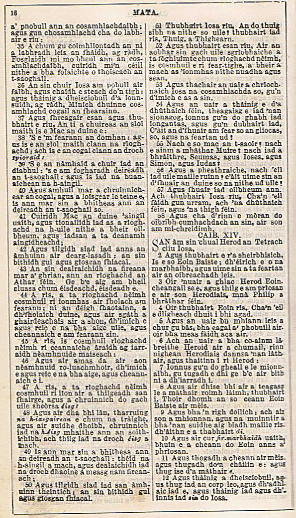 he noticed a Gaelic Bible, which he lifted up and opened to Mathew