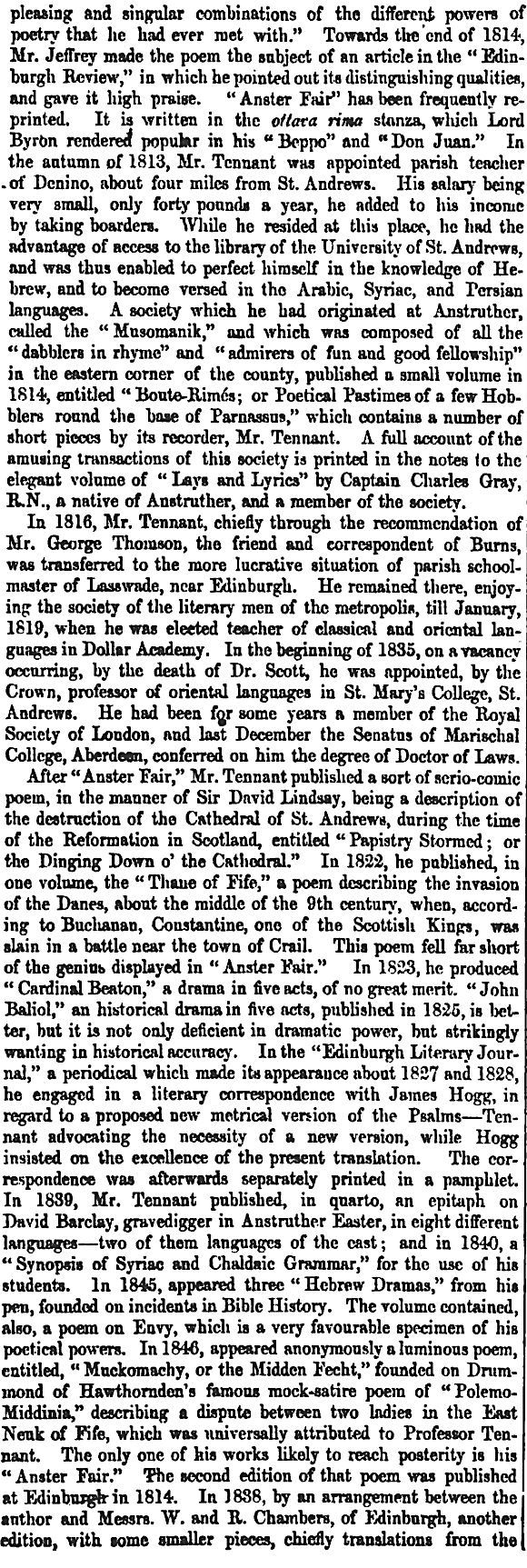 in 1309. John Tennant of Glenconner (1726-1810) was a friend of the poet Robert Burns