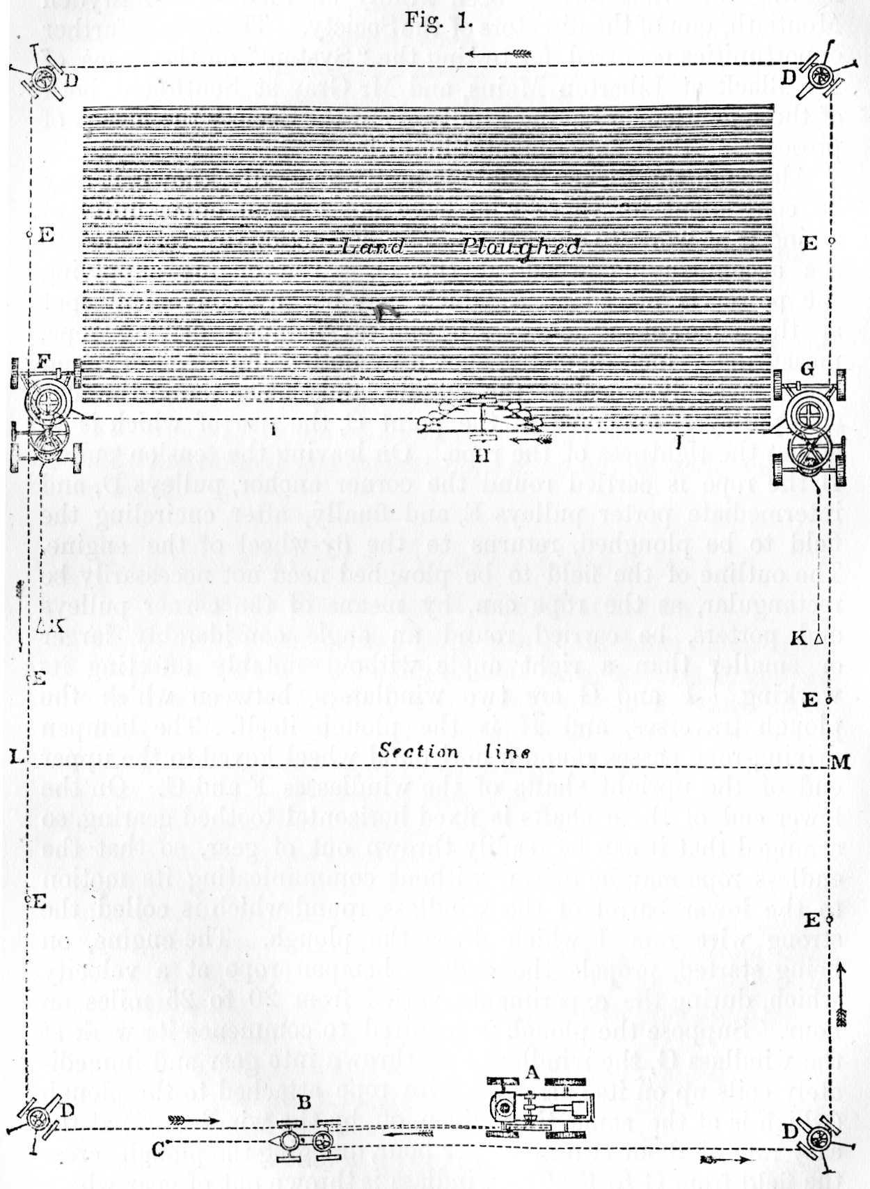 porter pulleys E, and finally, after encircling the field to be ploughed,