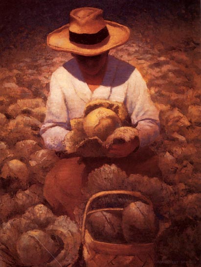 Woman with Head of Cabbage. Oil on Canvas with the Overland Trail Fine