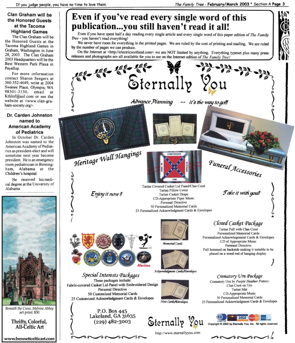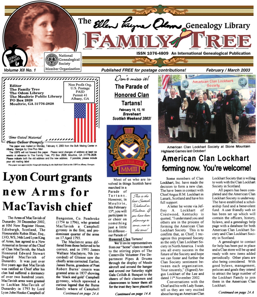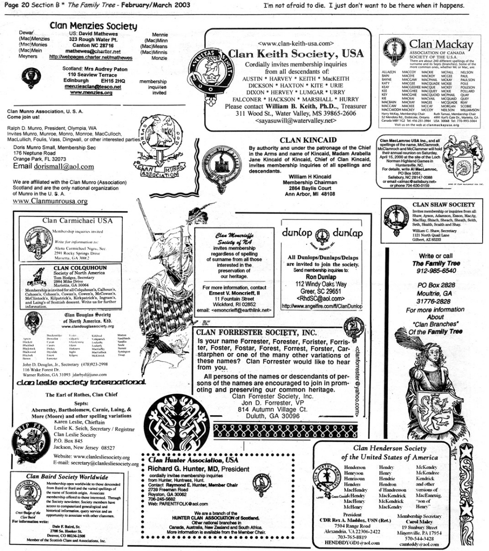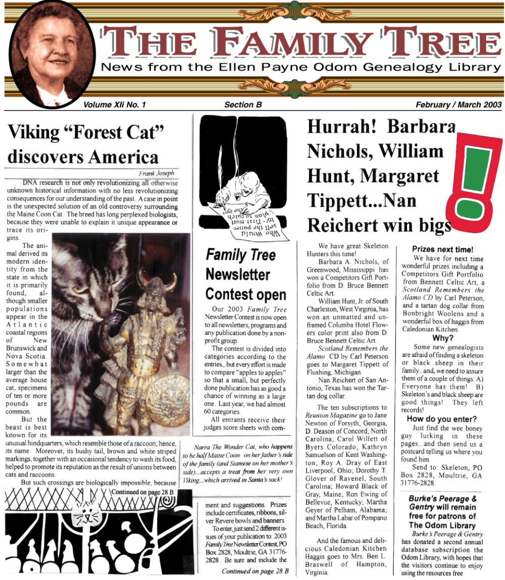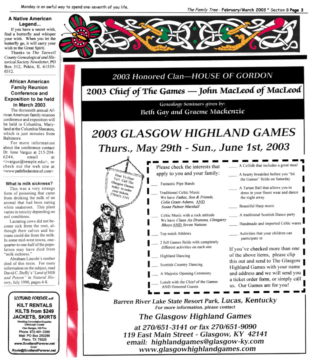 Skeleton Hunt: You get a chance each month to win a prize by finding the Skeleton hidden in the pages of the Family Tree. It's mighty easy to take part in all this fun. Just look very carefully at our pages and find the cute little fella trying to escape from his closet. Then send us a postcard. It might be a good idea, since two of our prizes need to know your Clan affiliation, to add that to your postcard... and then address it to: Skeleton, PO Box 2828, Moultrie, GA 31776-2828.
