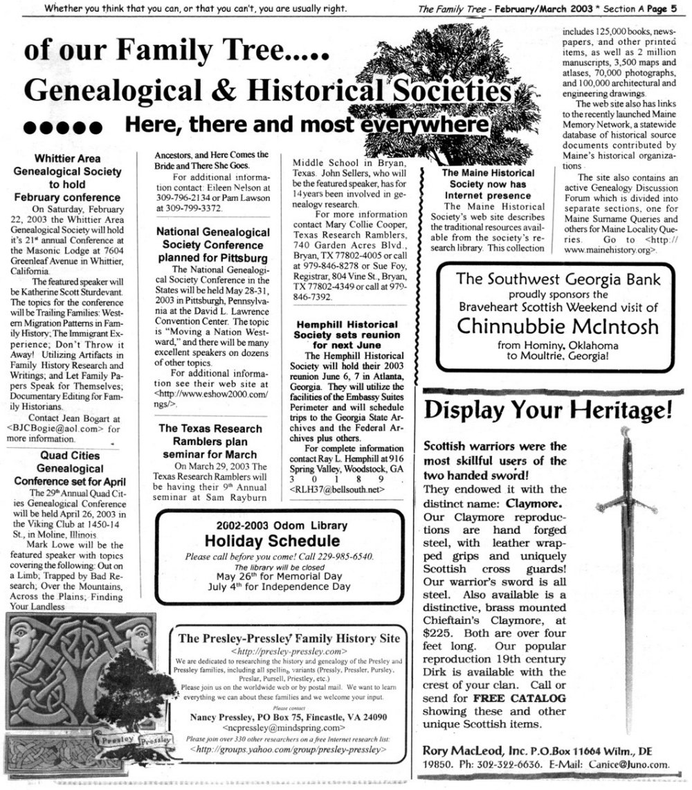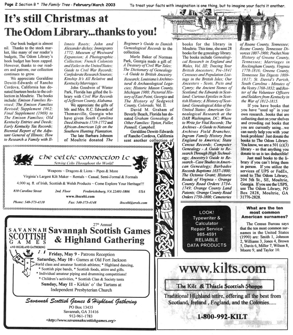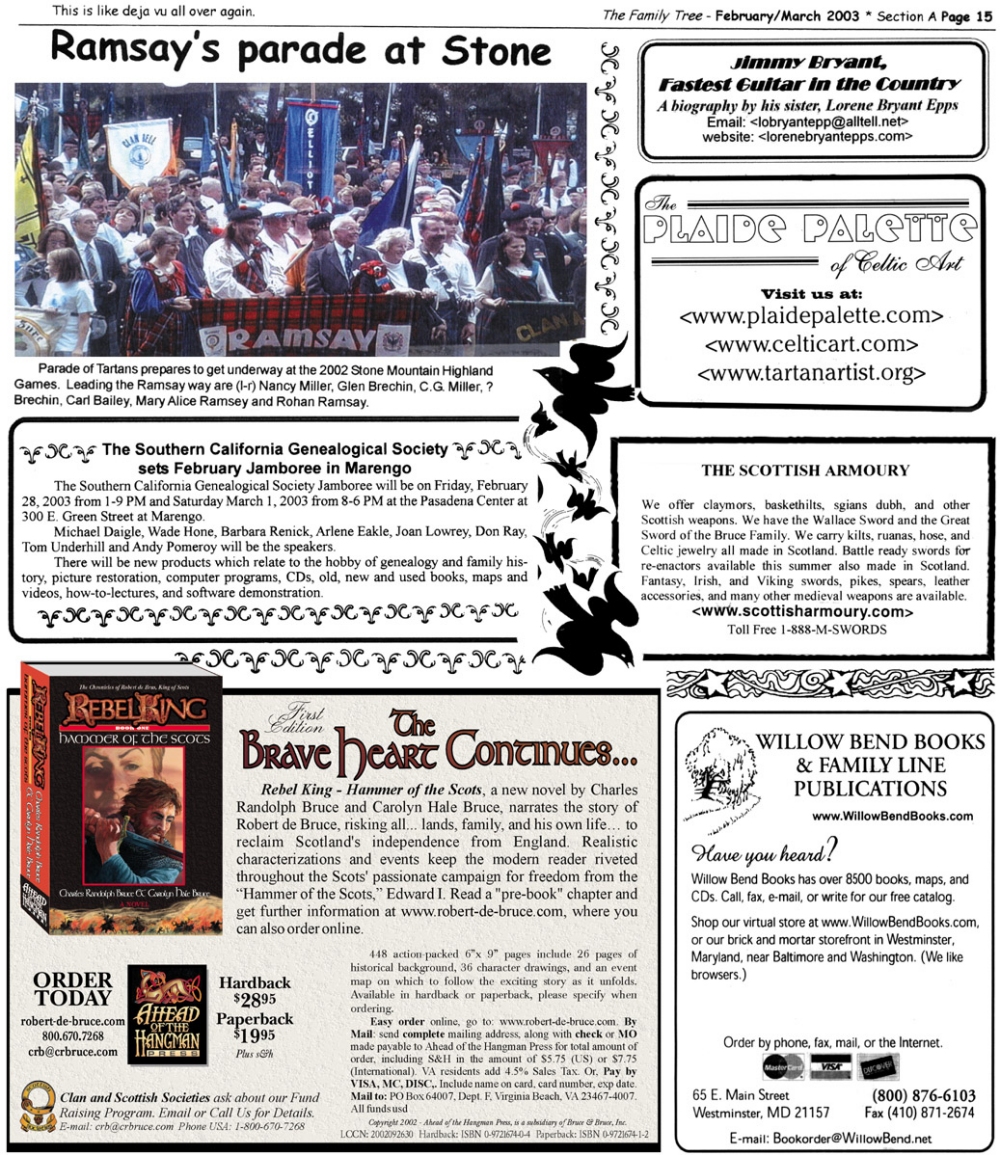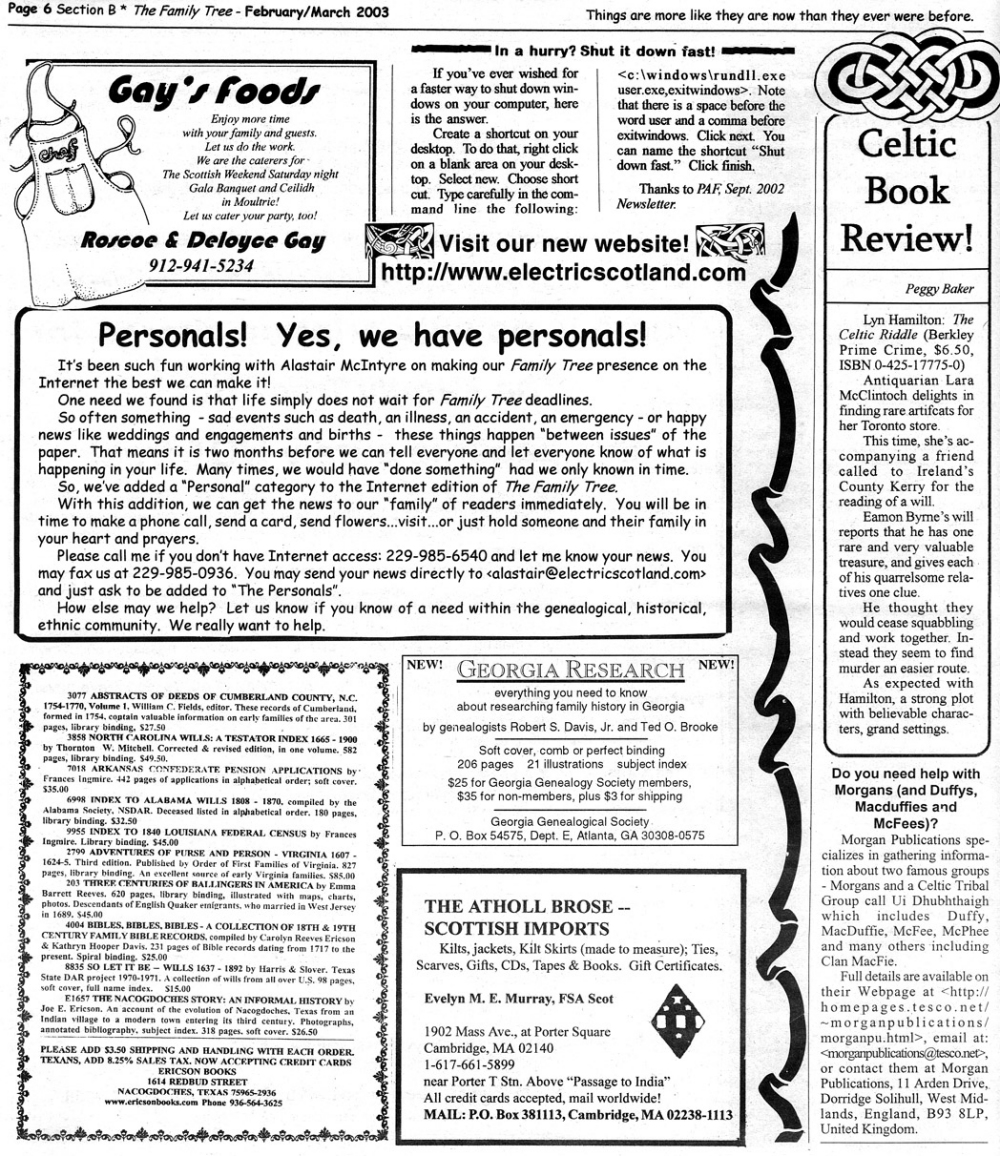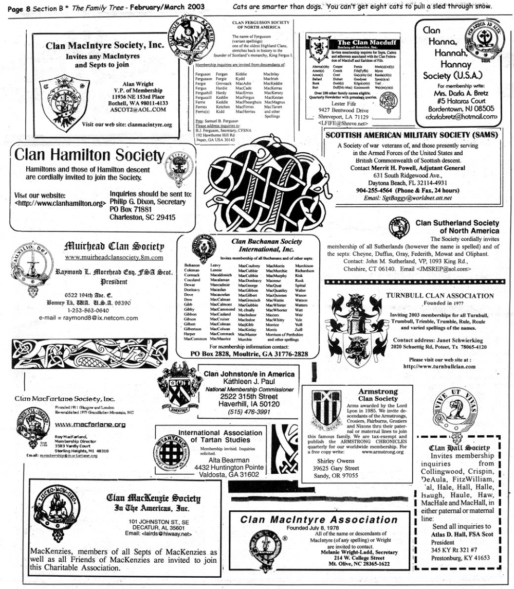 Skeleton Hunt: You get a chance each month to win a prize by finding the Skeleton hidden in the pages of the Family Tree. It's mighty easy to take part in all this fun. Just look very carefully at our pages and find the cute little fella trying to escape from his closet. Then send us a postcard. It might be a good idea, since two of our prizes need to know your Clan affiliation, to add that to your postcard... and then address it to: Skeleton, PO Box 2828, Moultrie, GA 31776-2828.