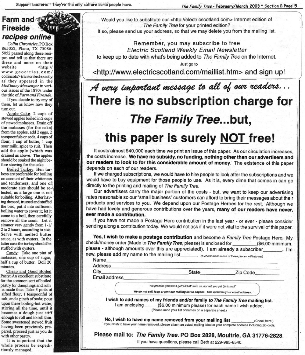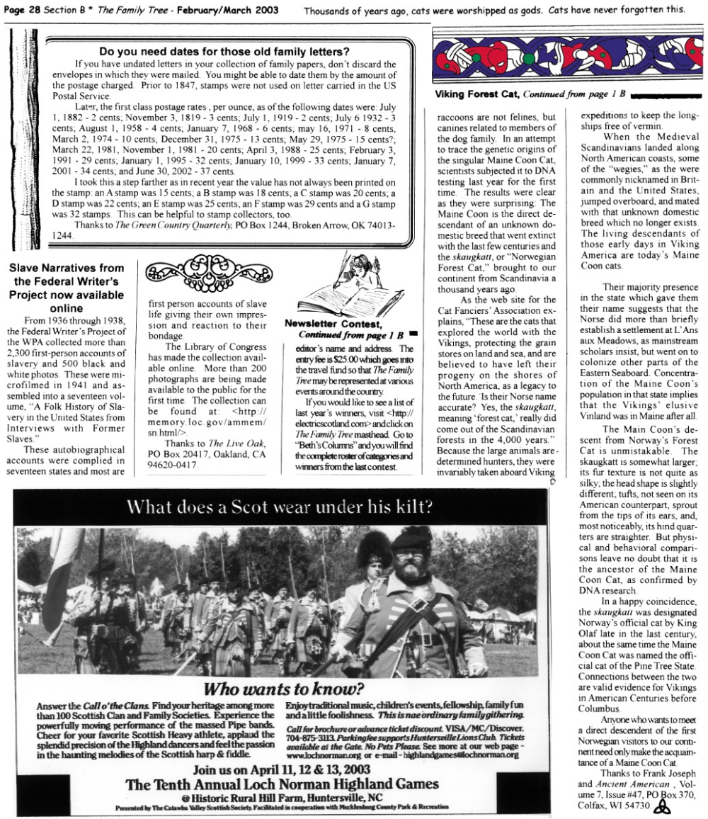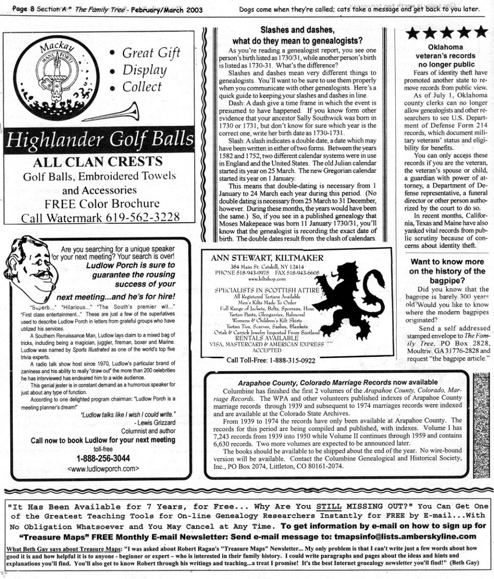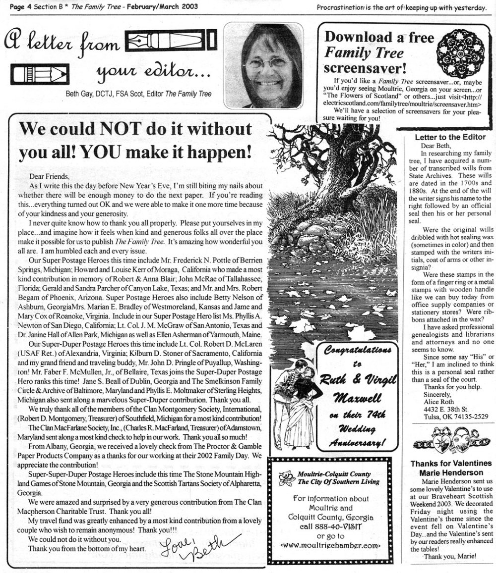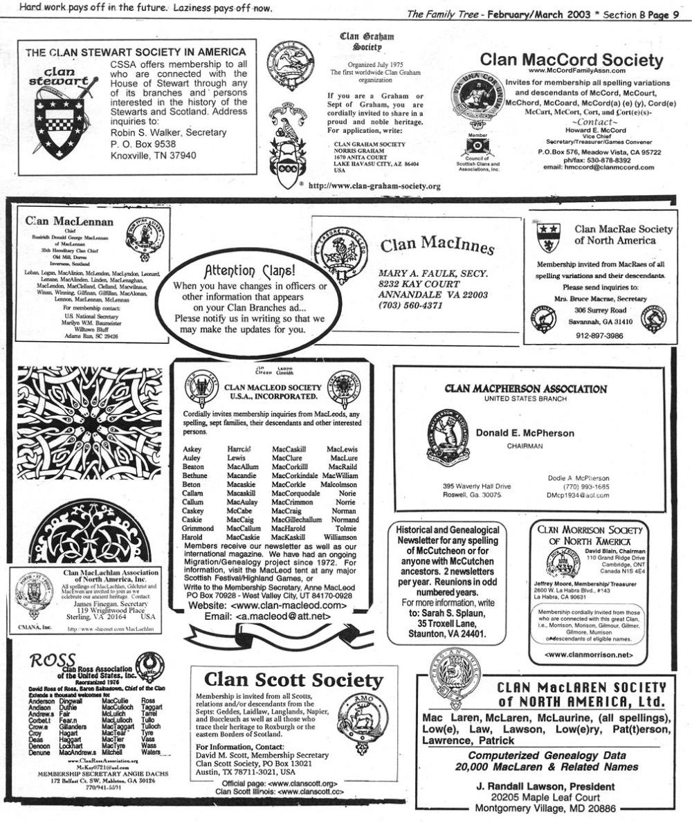 Skeleton Hunt: You get a chance each month to win a prize by finding the Skeleton hidden in the pages of the Family Tree. It's mighty easy to take part in all this fun. Just look very carefully at our pages and find the cute little fella trying to escape from his closet. Then send us a postcard. It might be a good idea, since two of our prizes need to know your Clan affiliation, to add that to your postcard... and then address it to: Skeleton, PO Box 2828, Moultrie, GA 31776-2828.