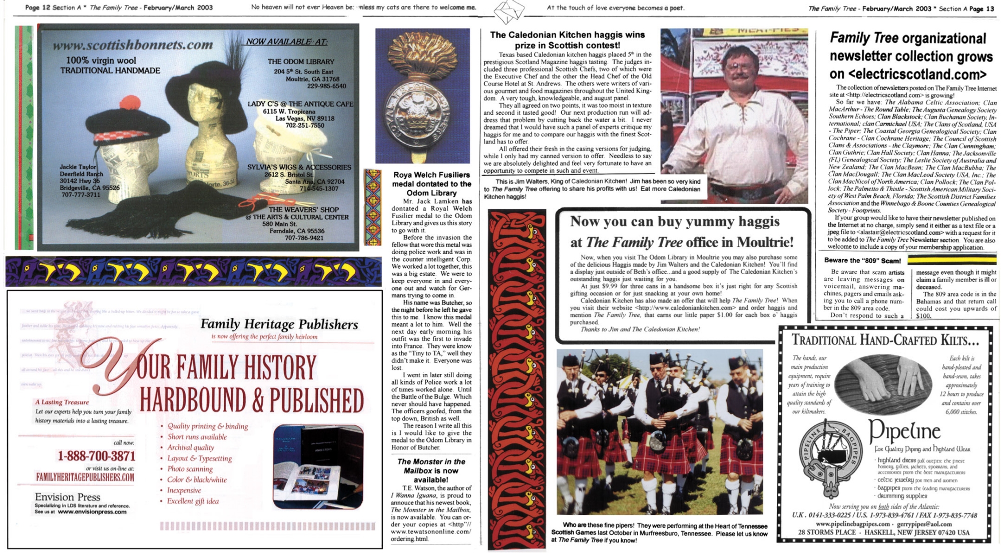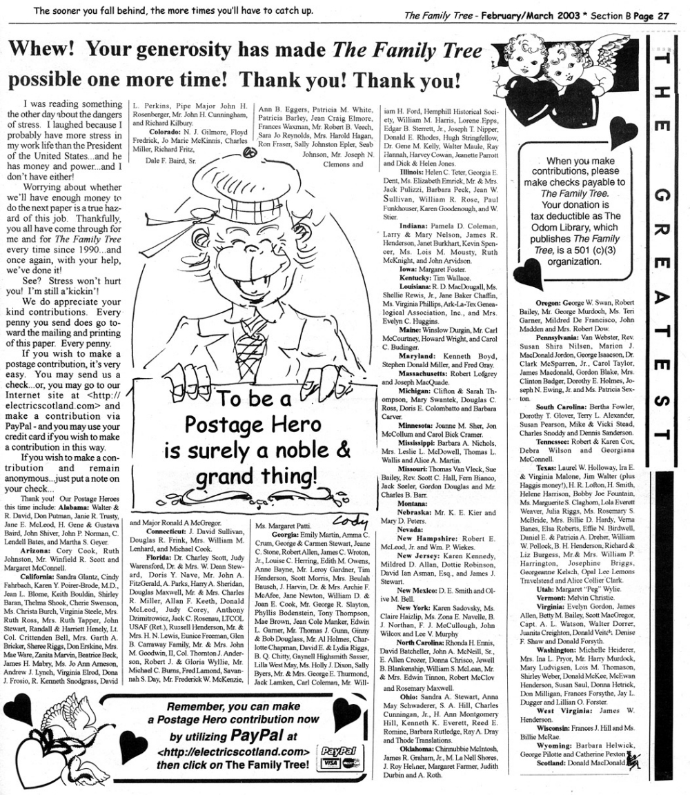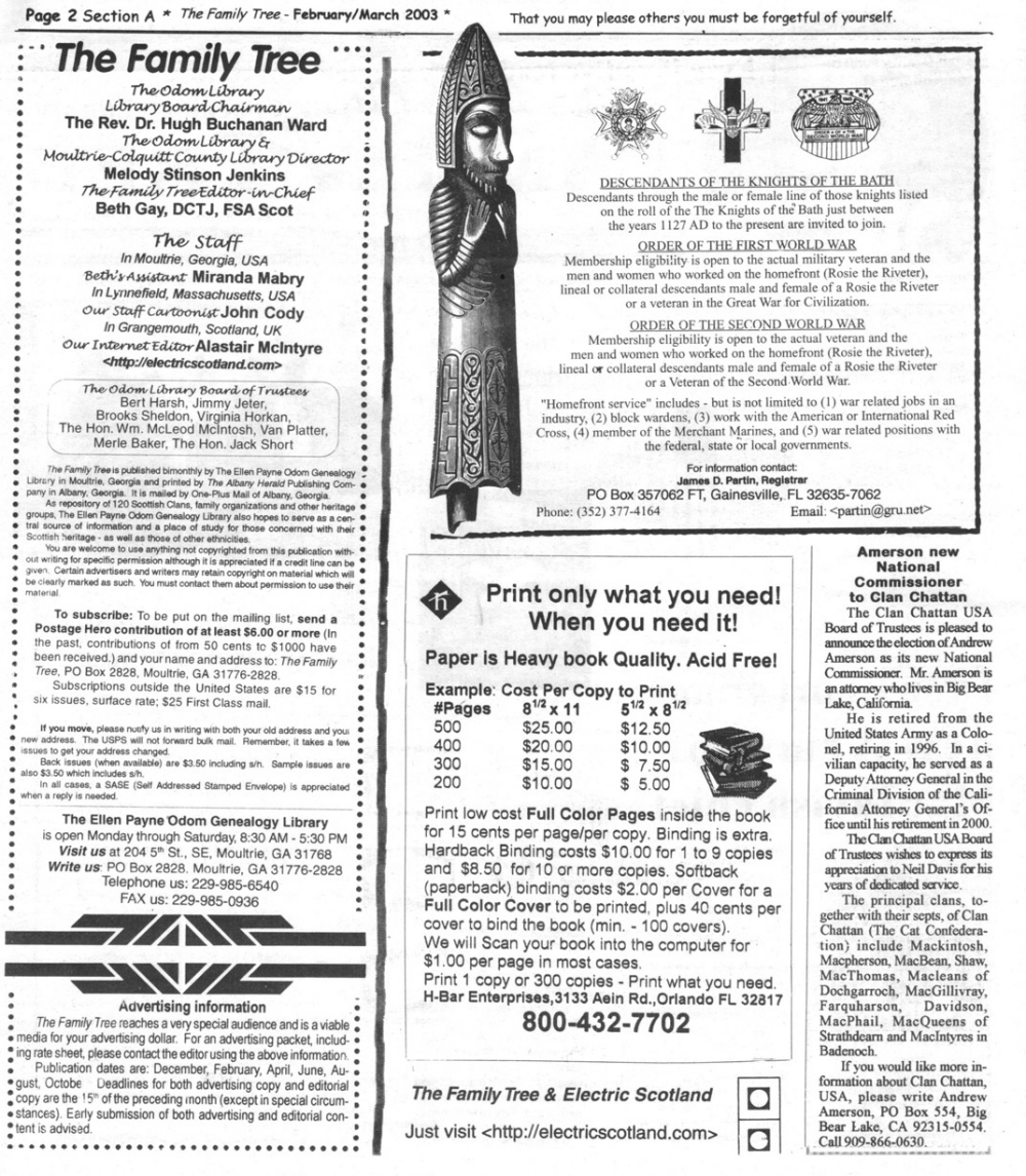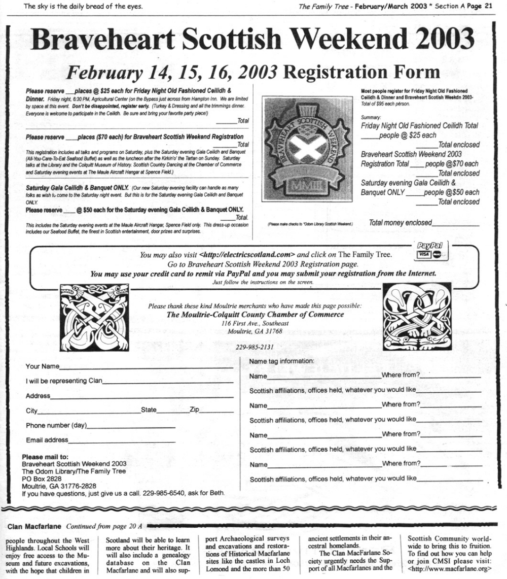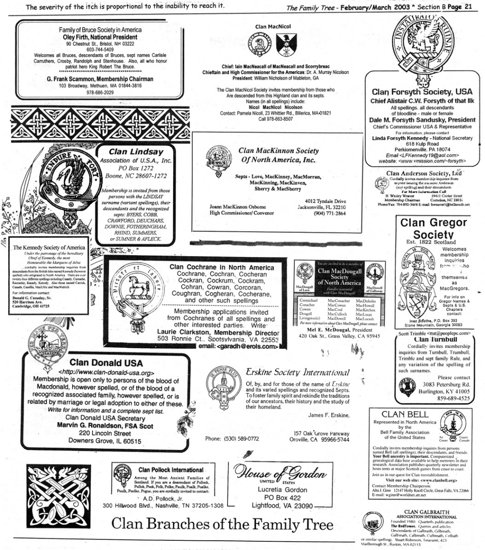 Skeleton Hunt: You get a chance each month to win a prize by finding the Skeleton hidden in the pages of the Family Tree. It's mighty easy to take part in all this fun. Just look very carefully at our pages and find the cute little fella trying to escape from his closet. Then send us a postcard. It might be a good idea, since two of our prizes need to know your Clan affiliation, to add that to your postcard... and then address it to: Skeleton, PO Box 2828, Moultrie, GA 31776-2828.