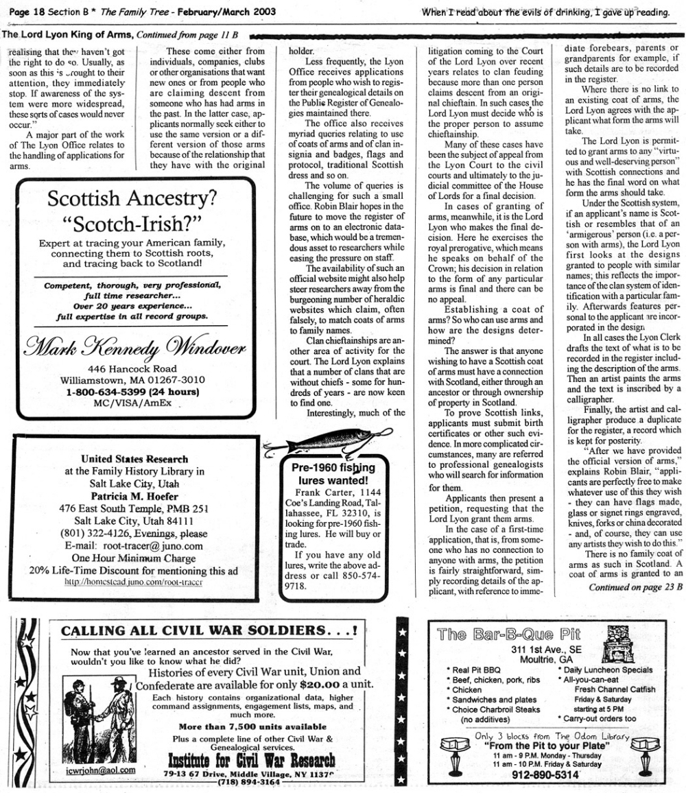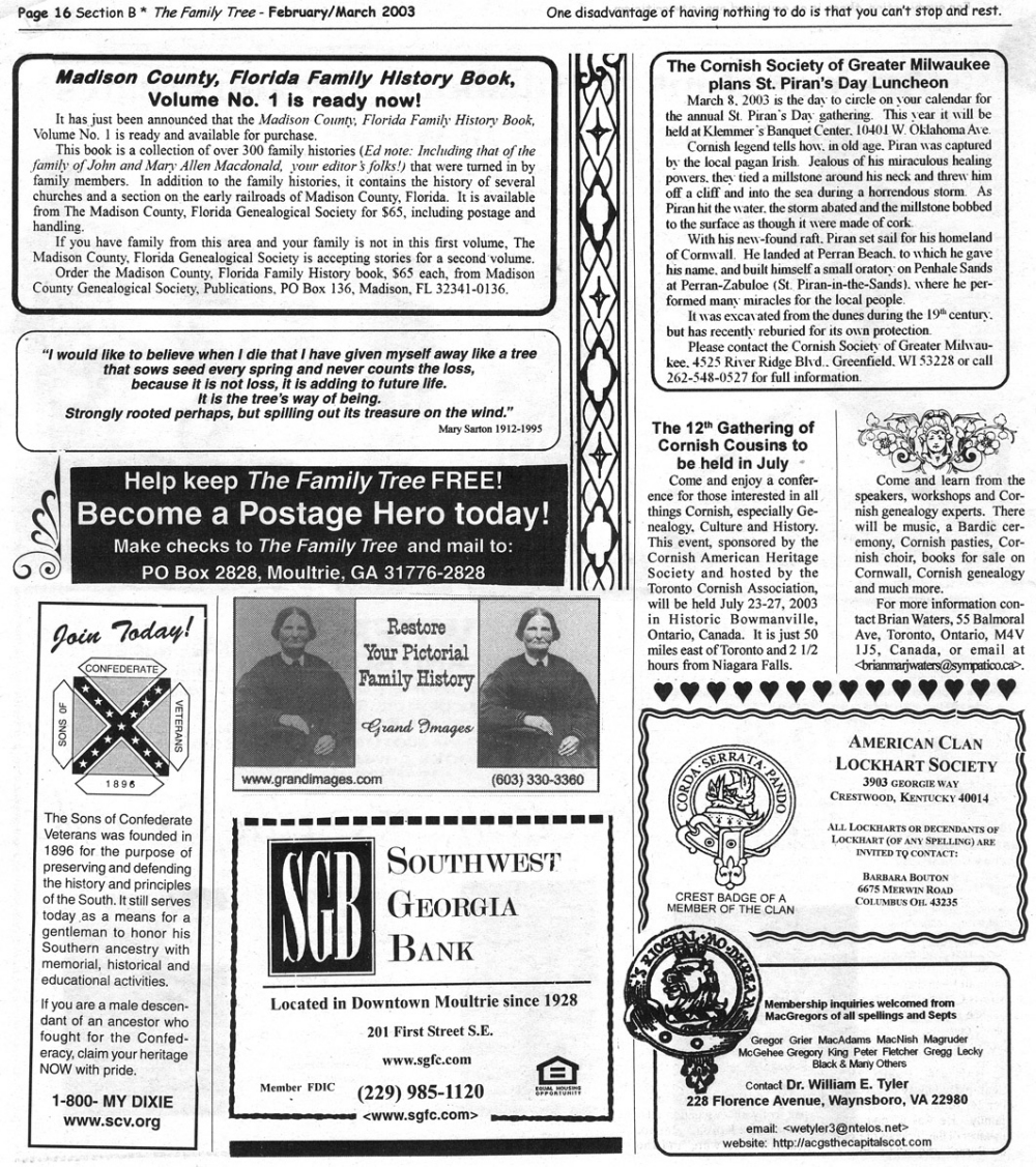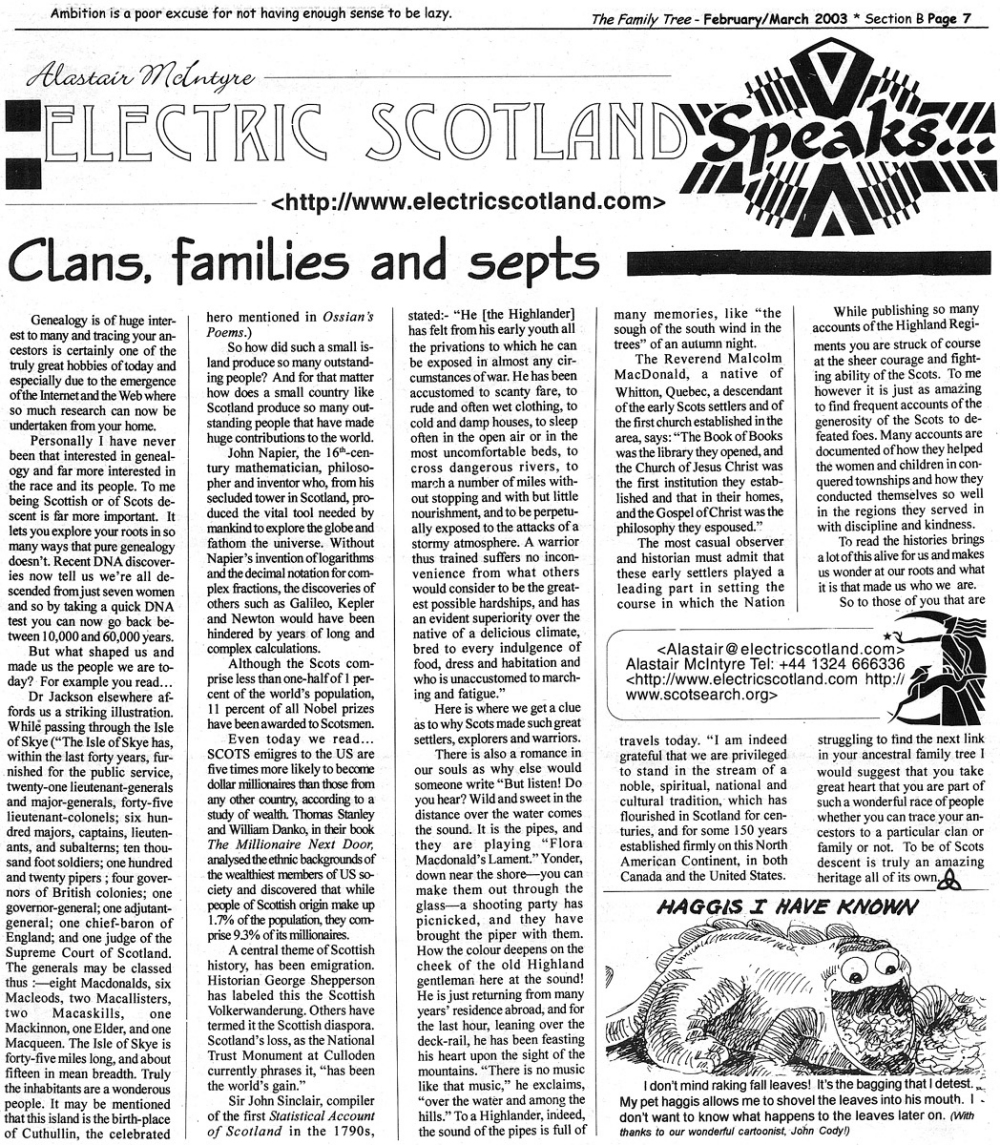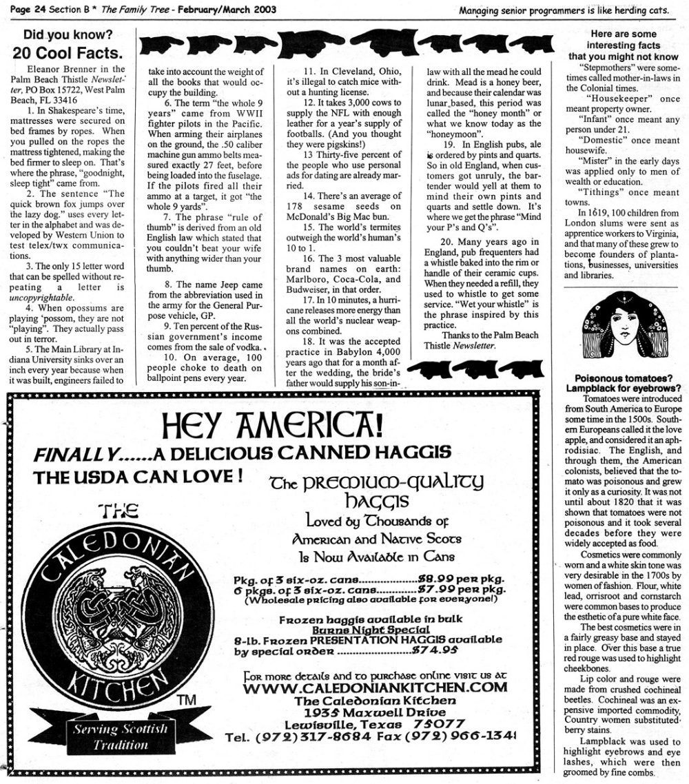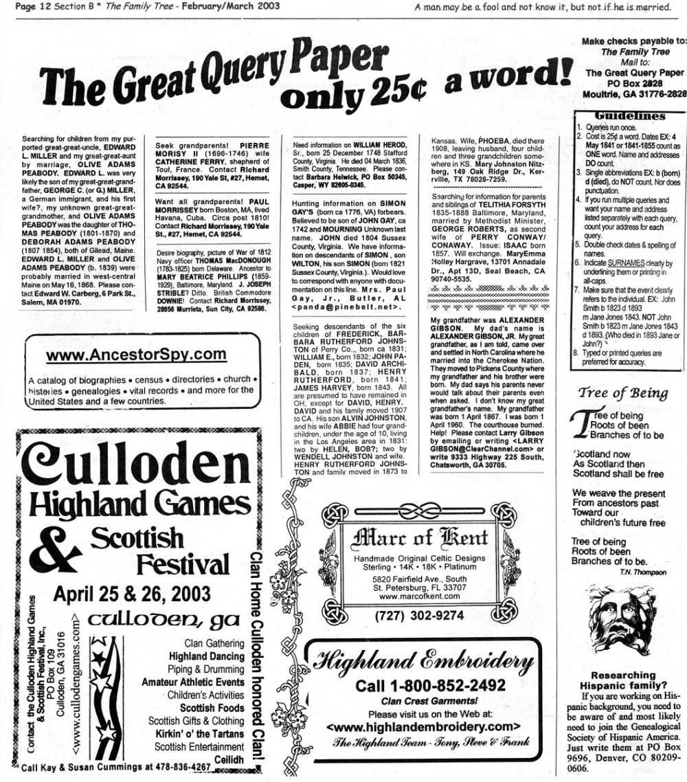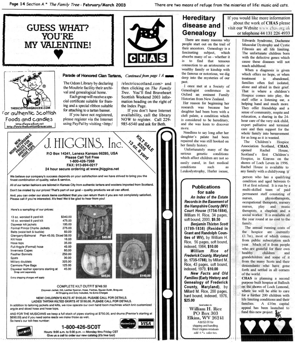 Skeleton Hunt: You get a chance each month to win a prize by finding the Skeleton hidden in the pages of the Family Tree. It's mighty easy to take part in all this fun. Just look very carefully at our pages and find the cute little fella trying to escape from his closet. Then send us a postcard. It might be a good idea, since two of our prizes need to know your Clan affiliation, to add that to your postcard... and then address it to: Skeleton, PO Box 2828, Moultrie, GA 31776-2828.