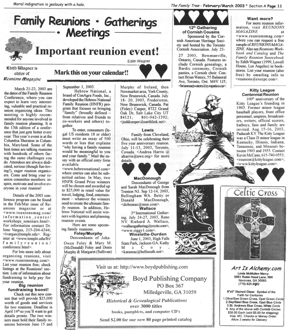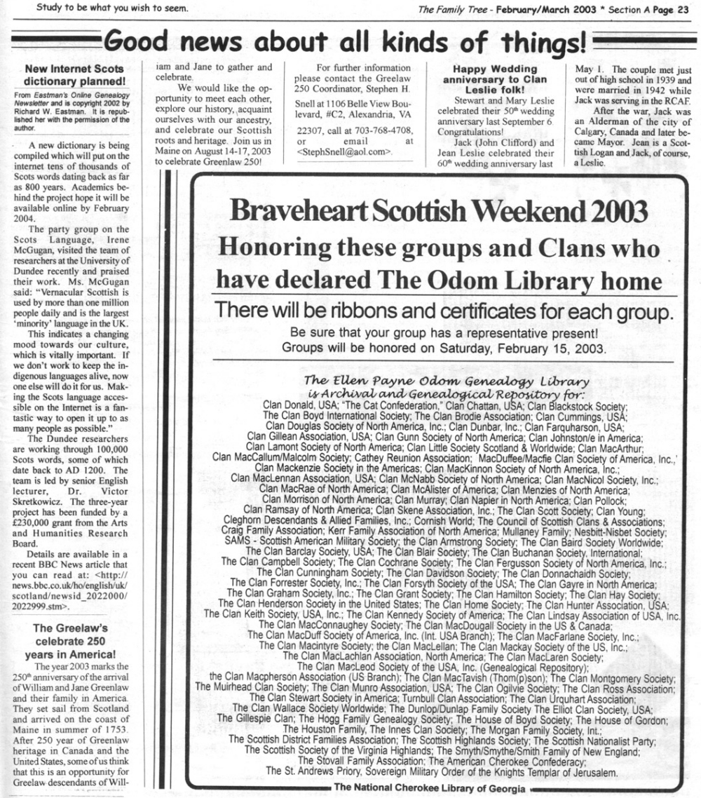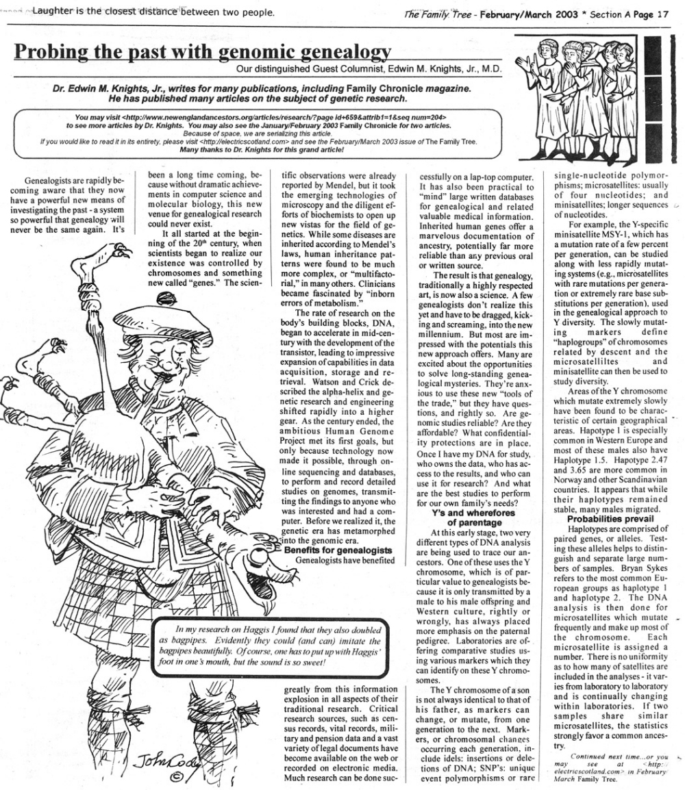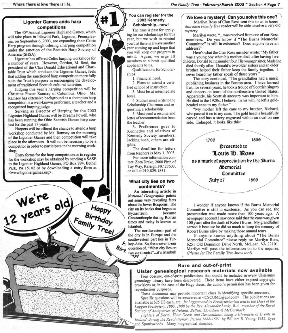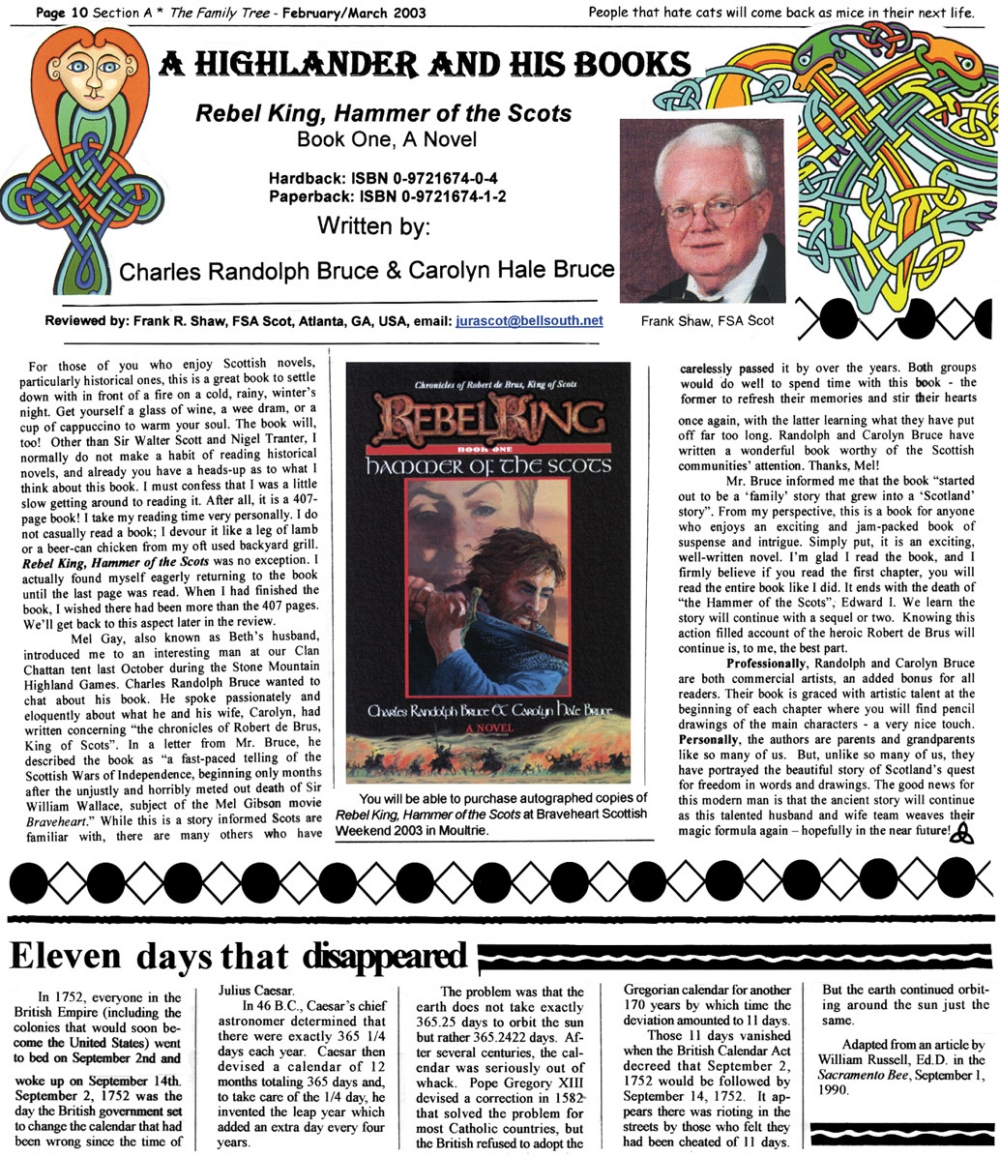 Skeleton Hunt: You get a chance each month to win a prize by finding the Skeleton hidden in the pages of the Family Tree. It's mighty easy to take part in all this fun. Just look very carefully at our pages and find the cute little fella trying to escape from his closet. Then send us a postcard. It might be a good idea, since two of our prizes need to know your Clan affiliation, to add that to your postcard... and then address it to: Skeleton, PO Box 2828, Moultrie, GA 31776-2828.
