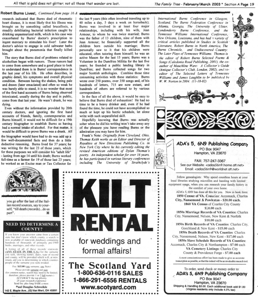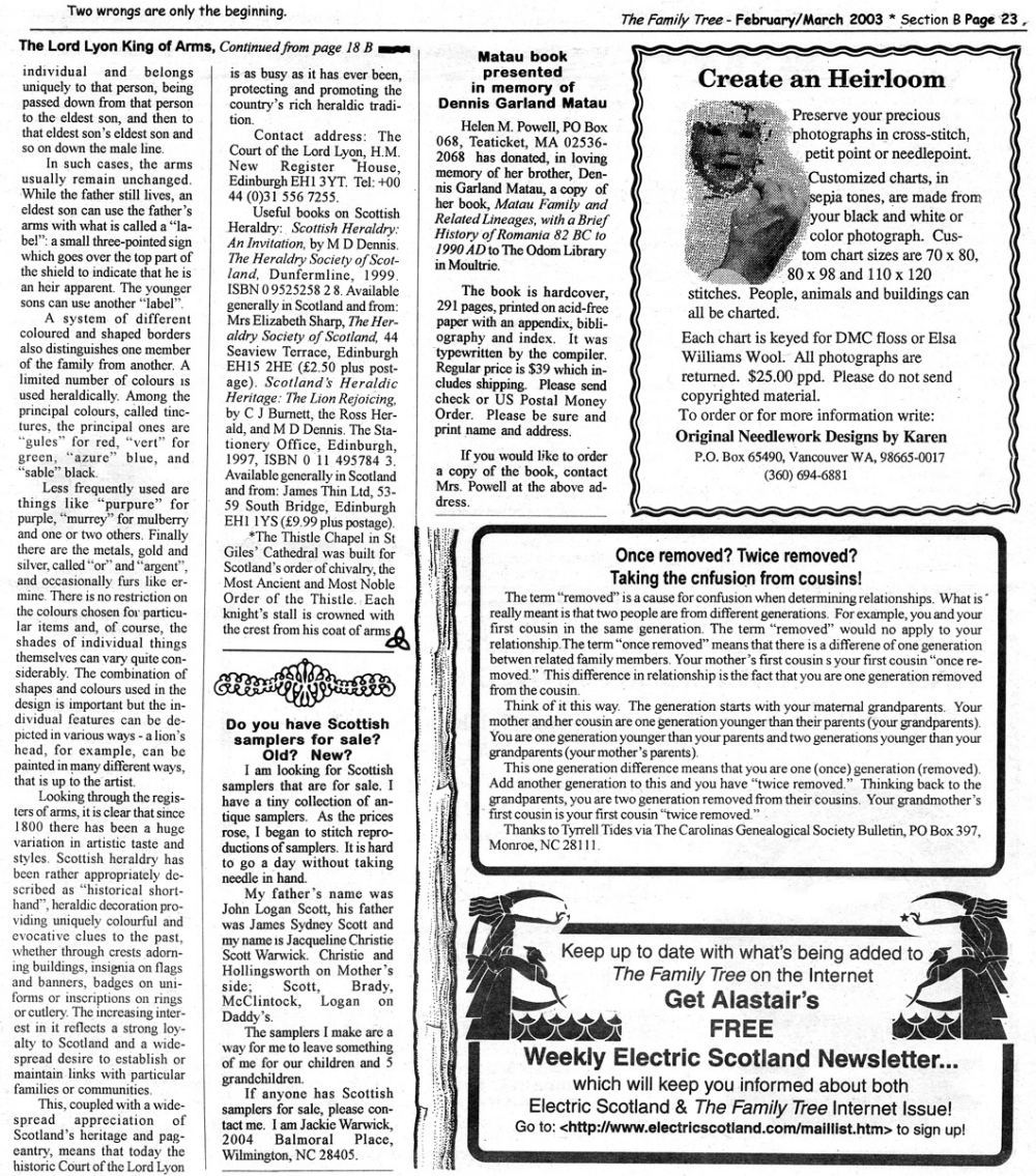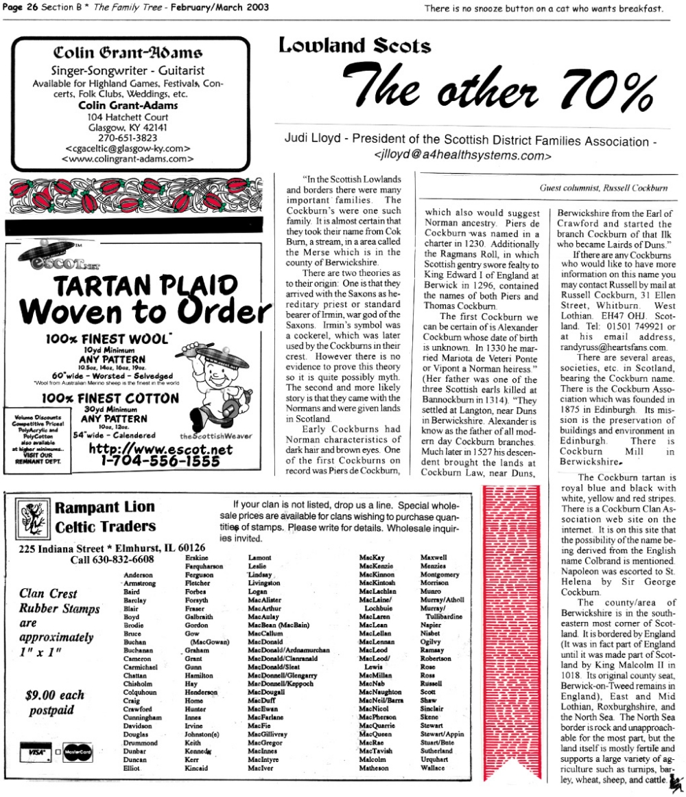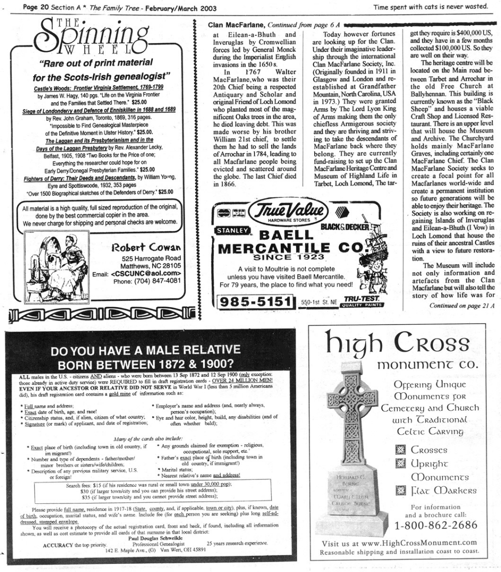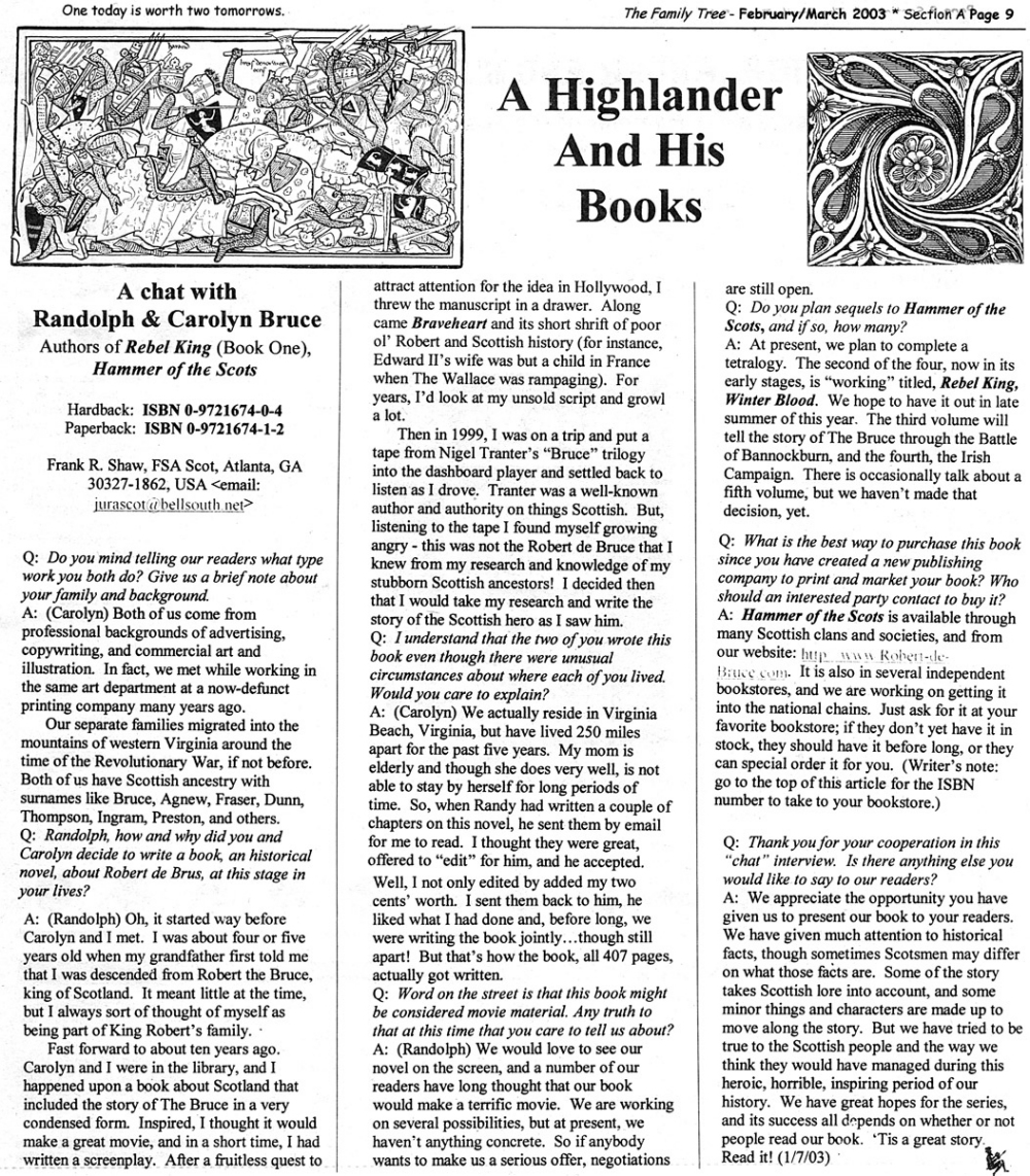 Skeleton Hunt: You get a chance each month to win a prize by finding the Skeleton hidden in the pages of the Family Tree. It's mighty easy to take part in all this fun. Just look very carefully at our pages and find the cute little fella trying to escape from his closet. Then send us a postcard. It might be a good idea, since two of our prizes need to know your Clan affiliation, to add that to your postcard... and then address it to: Skeleton, PO Box 2828, Moultrie, GA 31776-2828.