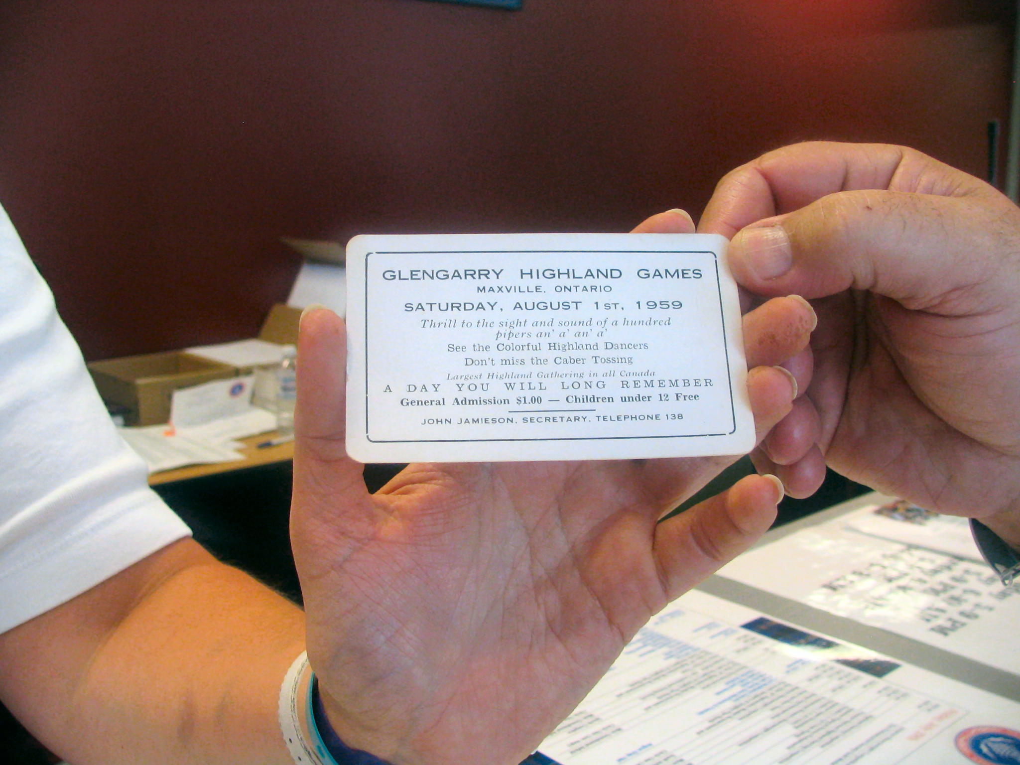 a pass for the 1959 Glengarry Highland Games which he was donating to