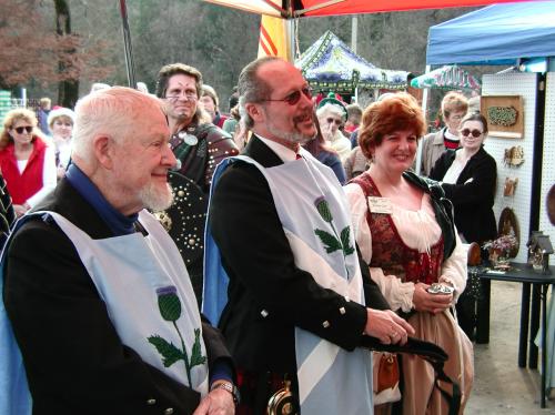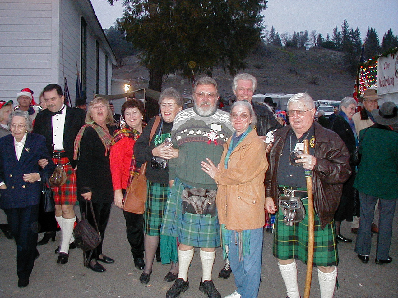 The Mother Lode Scots, like their counterparts the world over, enjoy participating in Scottish celebrations, where they have an opportunity to wear the kilt and the plaid - or just display a bit of their clan tartan to show that they, too, "belong". Some of these celebrations are true survivals of Scottish tradition such as Robert Burns' Birthday feast and St. Andrews Day. Others are of American origin, but harking back to old Scottish customs. There is the "Kirkin' o' the Tartan" when tartans are brought to a church to be blessed, and of course, the Scottish Christmas Walk. The Christmas Walk was originated rather recently - in 1966 in