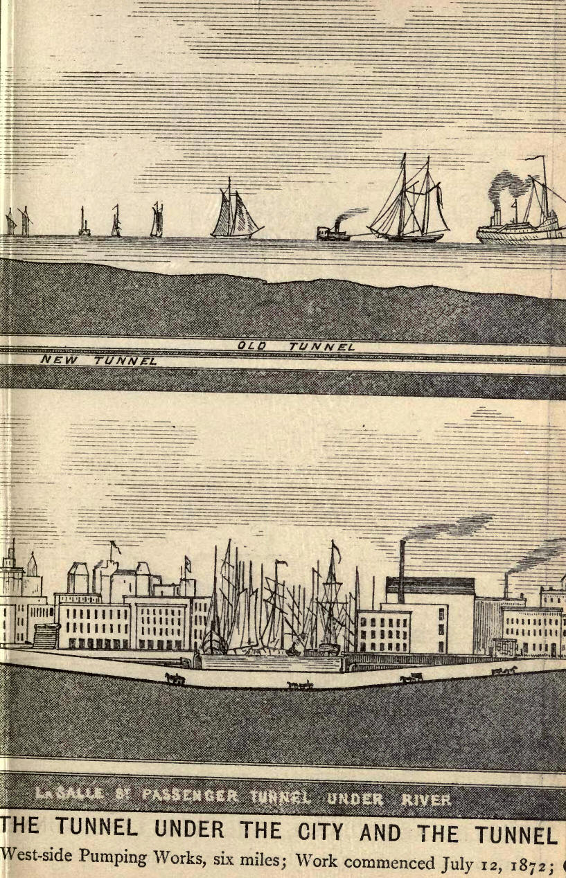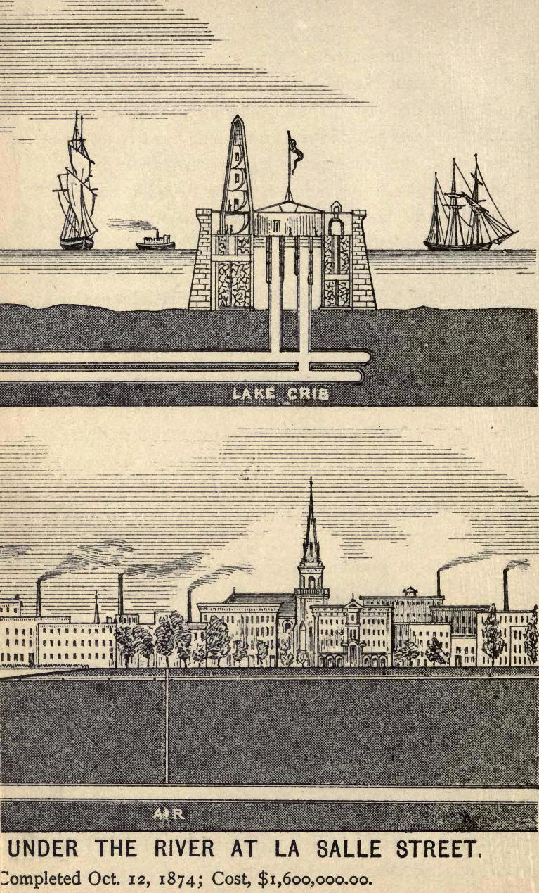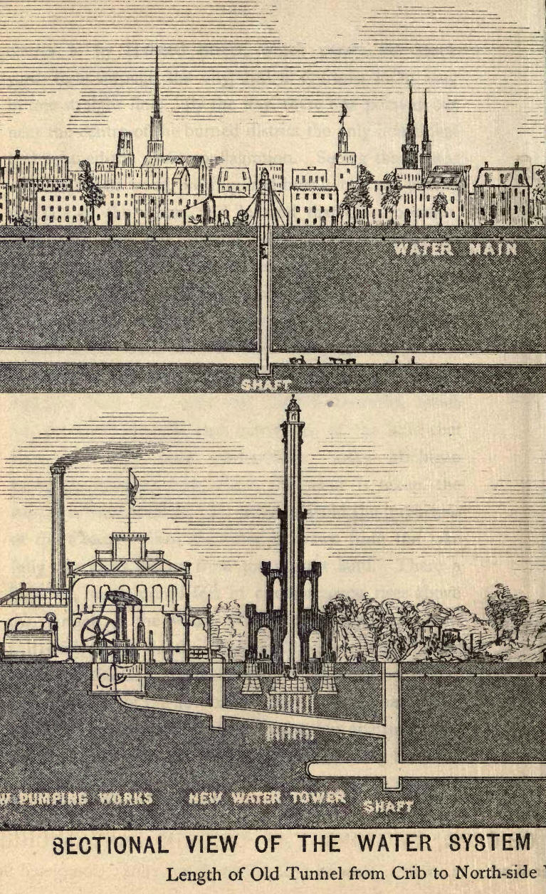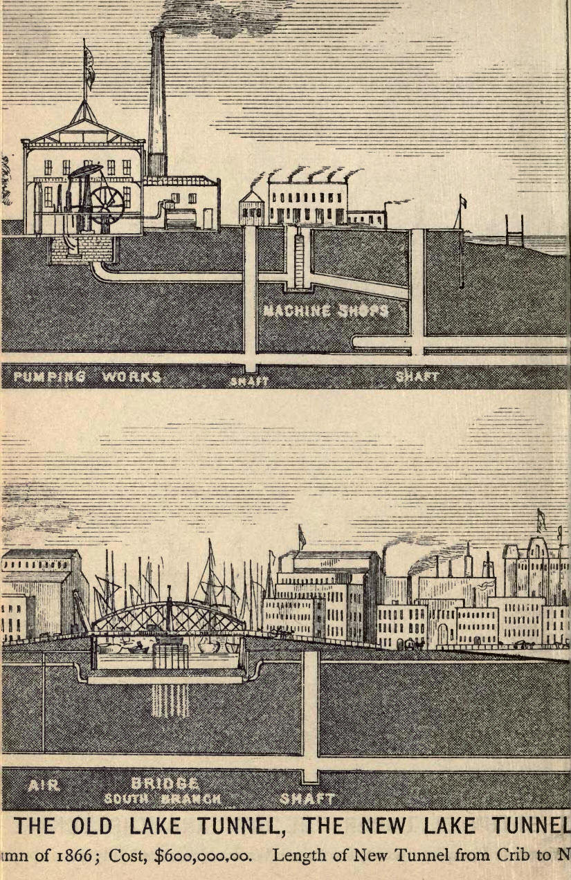 The first tunnel, begun in 1864 and completed in 1867, is about two and a-quarter miles long, and five feet inside diameter. The second tunnel was completed about six years ago, and is six miles long by seven feet in diameter. Both tunnels are water-tight, built of brick, and in each case fully two miles of the tunnel is carried out under the bottom of the lake at a depth of seventy feet from the surface of the water.