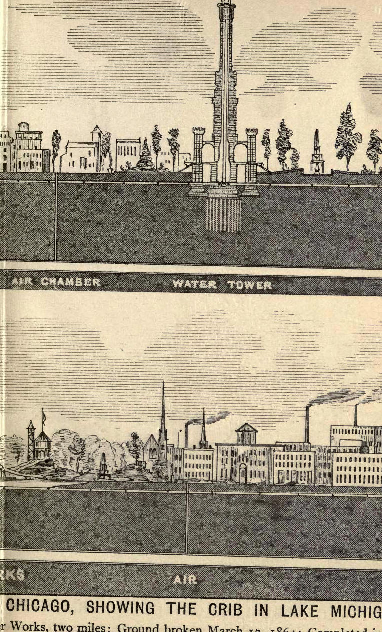 Leaving the straight course, and passing through Lincoln Park, we reach the City Waterworks, which are the most gigantic and marvellous of the kind that have ever yet been undertaken. Lake Michigan being the fountain from which the water is taken, the supply is inexhaustible. In order to avoid the impurities of the Chicago river, the water is drawn from the lake fully two miles distant from the nearest land. There a building, one hundred feet in circumference, rises above the surface of the water, which at that point is about thirty-five feet in depth. That building is founded on the bottom of the lake, and is surmounted by a lighthouse and signal station for the accommodation of vessels navigating the lake. In this building there are fitted up apartments for the waterman and his family, the centre being reserved for the shafts that admit the water to supply the city.