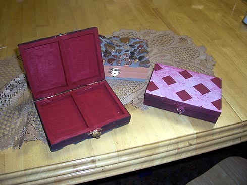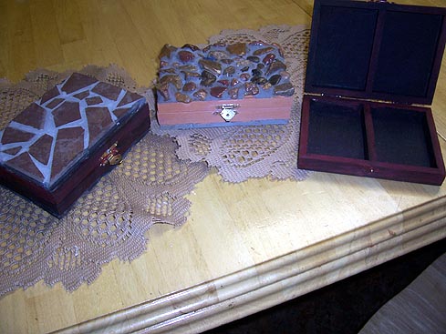 The children enjoyed doing these.  The insides were painted with acrylic paint. One box has river gravel glued onto it.  You can get this for 1.00 a package.  These came out of our drive.  After the glue has dried you can mix grout and put it on with a pallette knife.  Let the grout dry about 30 minutes or until it is firm and then take a lightly dampened cloth and begin to wipe the grout off the tile (or rocks).  When this is well dried then put a heavy coat of a good clear plastic on it.  You can spray the box all over easier than anything with this heavy plastic protector.  You want to buy the one that has a high gloss to it.  There are all kinds of stones for sale.  I used the river rocks just to try to encourage the children to learn to save their pennies.