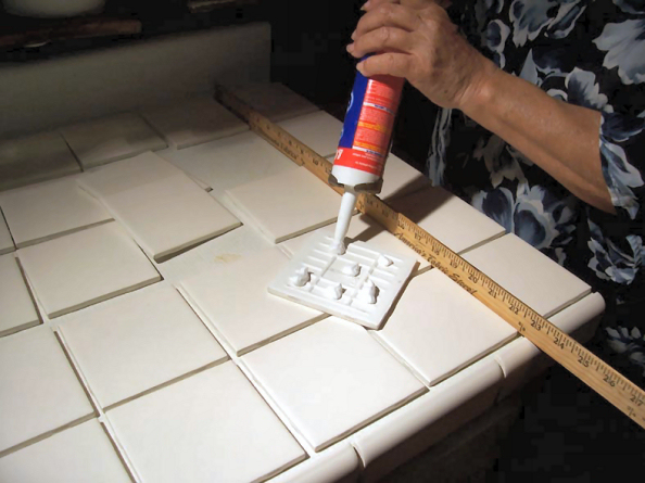 The third picture shows my little fat hand and brown skin, partly from my Ponca blood and some from loving the outdoors. I am squeezing out this hard as nails glue called "Grab it"  from a tube.  I've used this glue on floor tile before and it is immovable.  Ordinarily professionals use a grout down first to hold the tile in place.  I prefer the glue. For that matter I have used Elmer's glue. It is so strong a person has to tear up anything under it to get it off.  Glue works and is 100 times easier. Instead of putting those little spacers in to keep the tile straight I simply set a yardstick in between the tiles and it works just fine.
