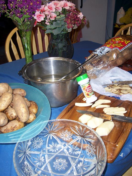 I went about peeling and cutting up the spuds. The glass bowl in front is