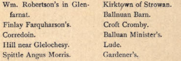 DUNCAN ROBERTSON of Drumachin was an ardent supporter of Prince Charles Edward, but through illness was unable to be out in 1745. He, however, did much for the Prince's cause in Atholl. After Culloden he skulked in the hills till the death, in 1749, of his kinsman, Alexander Robertson of Strowan, the Jacobite poet. By that event he succeeded to the chieftainship and estate. His wife and children were threatened with military execution if they stayed in a little hut where they had sought shelter. His tenants struggled in vain against the Government, which was bent on his ruin. He was in hiding in numerous places in Scotland until his escape to Holland in 1753. He reached Paris in this year with his wife and four children, having 39 louis in his pocket. His family had to live in exile for thirty-nine years. His two sons, Alexander and Colzear, were officers in the Scottish Brigade in the Dutch service.
