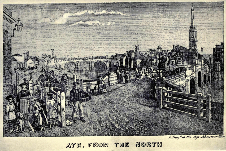 Eastwards of the Brig, but close to it, were in Burns' day many of the fair gardens, for which Ayr early had a name ; those on the southmost bank stretching in orchard and sward, in blossom and flower, from the clear waters' brink upward to the line of old houses bordering High Street and the Mill Vennel, the last named reminiscent of Abbey precincts and appurtenances. In the midst of the gardens the Auld Kirk of the Covenant, the successor of those of other faiths and days, then held restrictive spiritual oversight upon the town; its shadeless burial-ground, not so many years before made unlovely by the parsimonious destruction of its trees, cut down to form centring for the rebuilding of the Brig's fallen northmost arch. And there, too, in earlier days still, centuries ago from now, had been built in faith, and in the free beauty and meaning of the Gothic vernacular, the neighbouring Monasteries of the Black and Grey Friars; both in aftertime anger and bitterness of spirit, to be razed to the very ground; none the less their gardens and burying-places, as their churches, remain the progenitors of those of to-day, so surely does the past mould the present, and inexorably guide its trend. These thing's, the Brig saw and knew, as those others it has outlived. But all that is of the past, and belongs to far-away years; and now, it is difficult enough to realise the river of even Burns' time in the quay-bordered and railway-ridden banks, or the town, in the electric-power tramway-saddled streets of our creating. The High Street that in his day Robert Burns knew, with its projecting gables and outside stairs, lissomed with easy grace and not too rigid boundaries downward from the Fauldbacks, till midway at the Wallace Tower there debouched upon it the Mill and Foul Vennels; then passing in close succession the Meal Market, the Kirk Port, the then lately formed New Market Street dividing the one-time stance of the ancient Tolbooth, the strident and virago-tongued Fish Market at the Auld Brig end, it bore to the left, and its sinuous length drew on to the Sandgate and later Tolbooth, with its "Dungeon Clock" and memorable nineteen steps. At the junction of these two streets, stood the old Mercat Cross of Charles the Second's time, in the waning glory of once beautiful masonry; but its tall slender stone shaft was even then surmounted by its carven capital with thistle and rose, harp and fleur de lis, superimposed upon which and crowning all, was the copper unicorn with its staff and banneret.