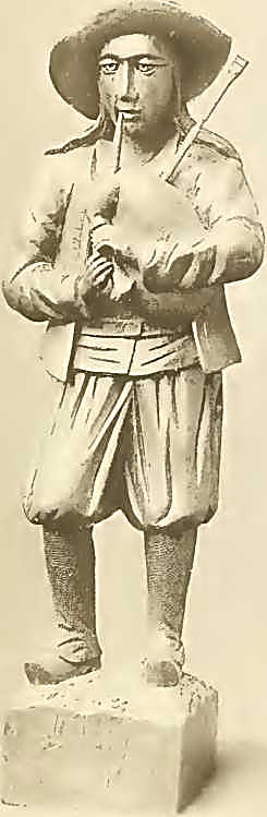 Photograph: a small wooden piper playing on a one-drone Pipe. Found al Dinon, in France. Supposed to be taken from an old church when it was being dismantled.