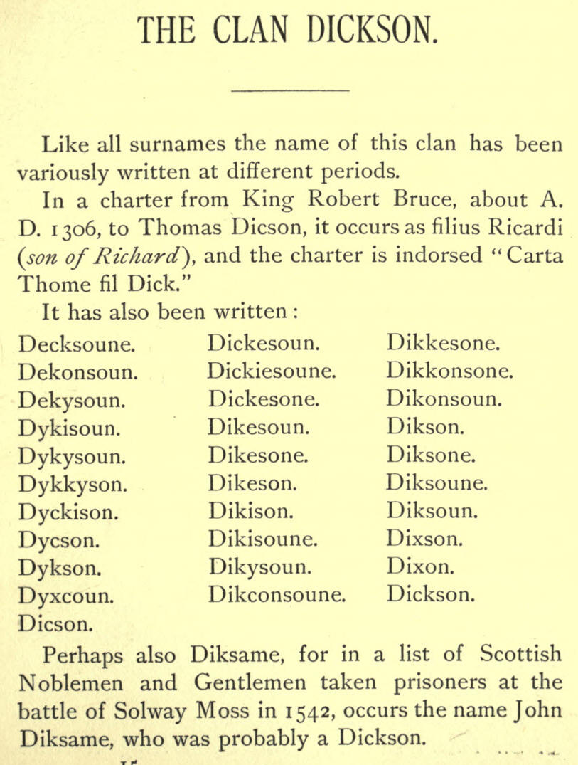 Dickson is now the usual form in Scotland, but in England where the similar name is not a clan name, and where there are numerous different families who do not pretend to claim a common origin, but all derive their surname from being sons of various Dicks, it is almost invariably written Dixon.
