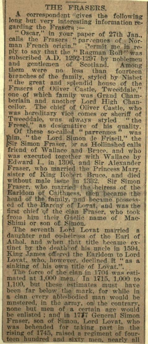 The youngest son of above Alexander was Brig. General Simon Fraser younger of Balnain, who was killed at the battle of Saratoga in 1777. He was the officer who answered the challenge of the sentry at Quebec in French, and made him l believe the troops who scaled the Heights of Abraham were the French Regiment de la Reine. They were suddenly challenged, but Fraser, who had been educated in France and spoke the language -fluently, without losing his presence of mind exclaimed, "Hold your tongue, you fool, have you seen the English?" The sentry not being able in the dark to distinguish the uniforms and fearing to offend one of his own officers hesitated before demanding the countersign, and in that moment his musket was seized before he could fire and give the alarm. A few years after at Saratoga the American General perceiving that General Burgoyne (who was afterwards court-martialled) had lost his head, called two of his best riflemen and said, "You see that brave officer on the white horse. It goes against my heart to do it, but you must pick him off or we lose the battle." They succeeded, and the Americans won the day, Fraser being the second in command under Burgoyne.