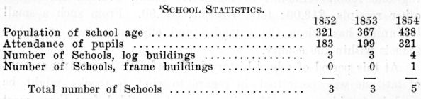 "In 1853 and 1854 considerable progress was made. Settlers were coming in freely and the population of the County rapidly increasing, the erection of school-houses was not neglected. The people, as a rule, did wonderfully considering their circumstances, and large were the demands made upon their muscles and purses in moving into this then wilderness country and making a beginning in clearing the forest and erecting places to dwell in.