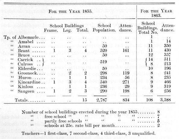 The first detailed school statistics of common schools in the county of Bruce that the author has met with are those for the year 1855. They are here given, and to indicate the process of development, those for 1863 are given in part also: