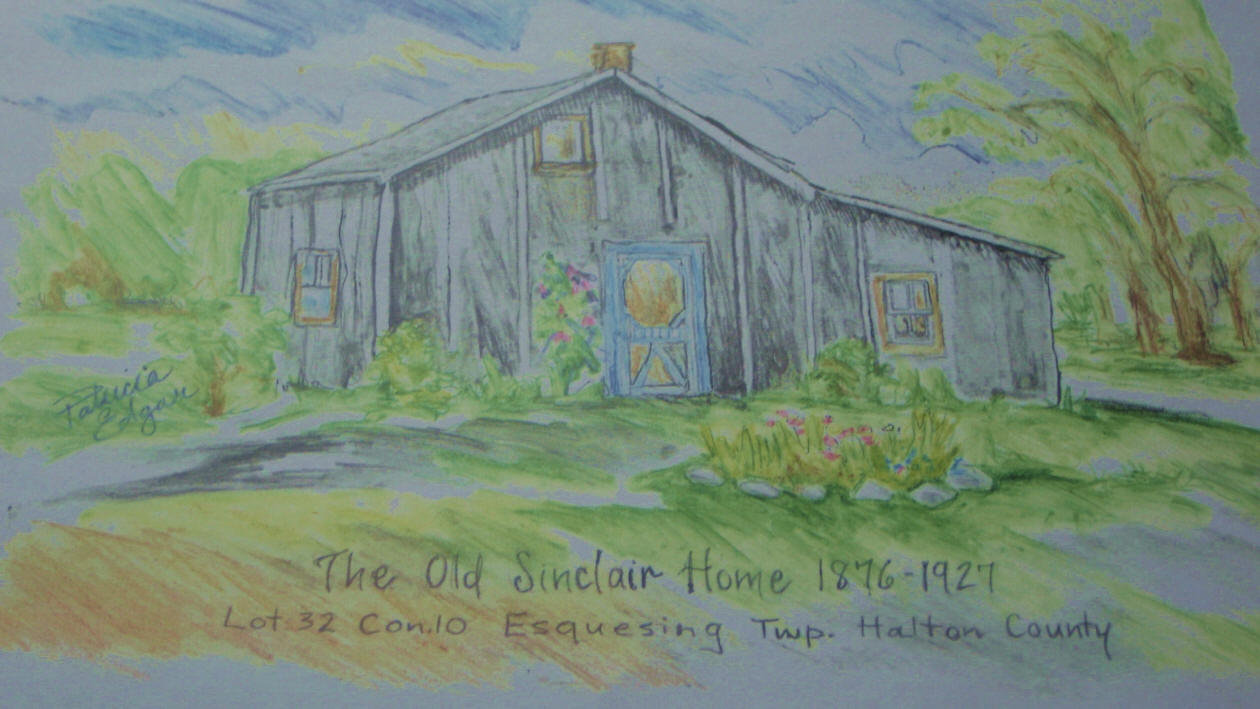The original homestead of Gilbert Sinclair is seen in the drawing above. Both Norm and Bessie Sinclair (my grandmother) grew up here. A description of the farm which Norm and Alma lived in is described in the Tweedsmuir histories http://www.wcm.on.ca/tweedsmuir/pdf/TownofErin/BallinafadWI/1/137.pdf .