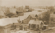 Although the Post Office was established as early as 1834 and the first survey of town lots made in 1837, it was not until about 1850 that the place gave any indications of developing into a center of trade and industry such as it has since become. Like all other centers within the bounds of the County, the first and most important influence impelling a noticeably forward movement in its progress was that of the lumbering industry. The district round about was covered with the best of timber, especially oak and elm, and its good location as a vessel port gave to it an opportunity for advance when the timber became marketable, which its enterprising inhabitants were not slow to seize. For the next ten years the lumbering industry was at its height, and, save for the lull in the year 1857, when, owing to the financial heard times then existing, there was considerable unemployment among its inhabitants, Wallaceburg went forward with rapid strides. The lumber industry in this decade brought much business and settlers to the town. As it was with the Thames River, so also with the Sydenham, its banks were lined every winter with timber sticks and staves and in the spring of the year its waters were made hardly discernible because of the numerous qualities of these floating down on its surface to find a market at Detroit and elsewhere. But the prosperity came through the development of the surrounding farmlands and the establishment of industries. The next decade, 1860 to 1870, was a period of transition. As a source of employment every year in this period the timber business was getting more precarious. Every increase in the production and exportation of square timber, staves, lumber and cordwood, lessened the quantity of its agricultural productions increased, the village grew proportionately. It was not so rapid a progress as the lumber industry brought to it but it was permanent. Wallaceburg was saved from the fate of many other equally thriving lumber centers by its position on a navigable river and the rapid increase of settlement on the surrounding lands of the district. In the transition from one source of dependence to the other, progress lagged but did not entirely cease.