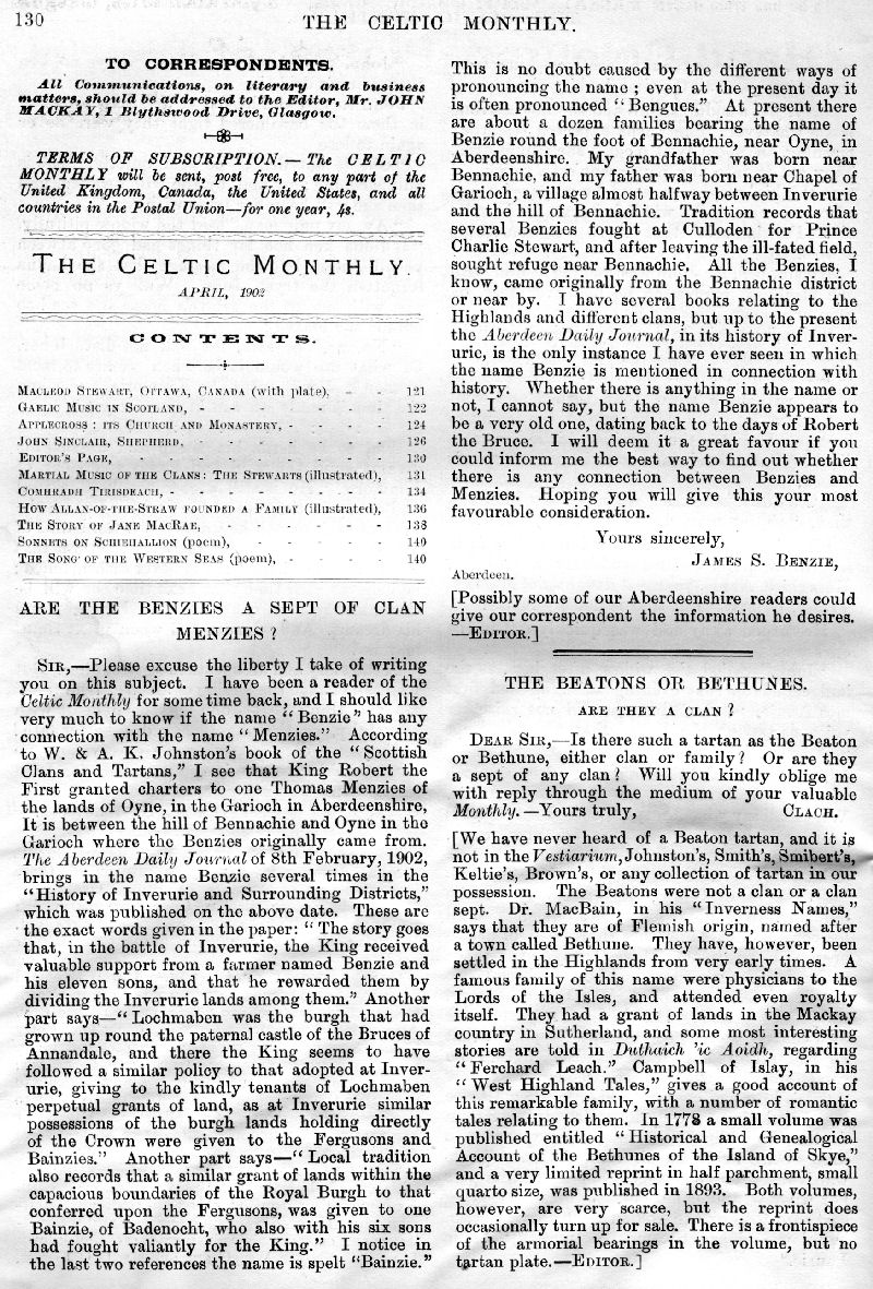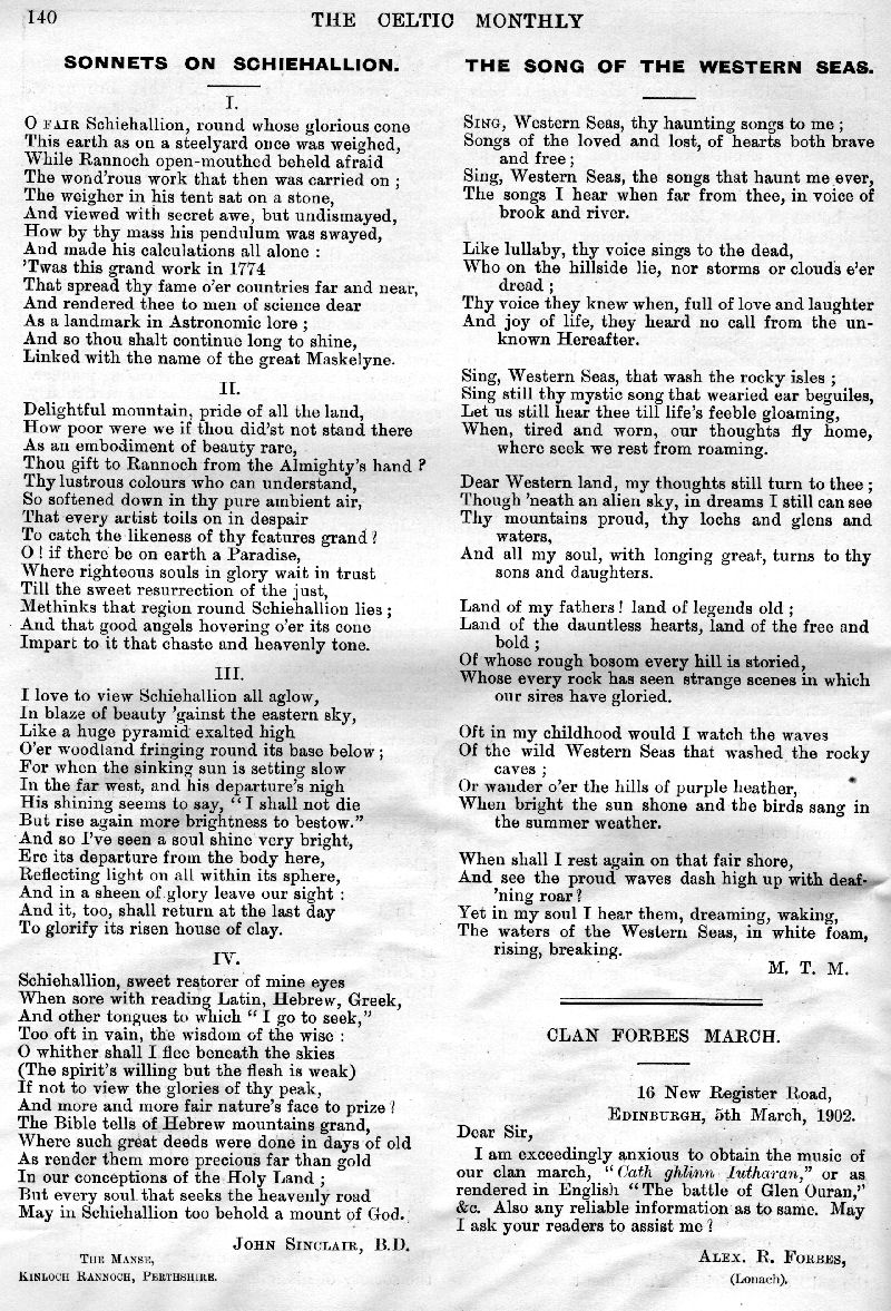 MacLeod Stewart Ottawa Canada, Gaelic Music in Scotland, Applecross: Its church and monastery, John Sinclair, Shepherd Part III, Are the Benzies a sept of Clan Menzies, The Beatons or Bethunes, The Martial Music of the Clans, Comhradh Tirisdeach, How Allan-of-the-Straw founded a family - A tale of the MacLeans of Torloisk, The story of Jane MacRae, Sonnets on Schiehallion, The song of the Western Seas, Clan Forbes March.