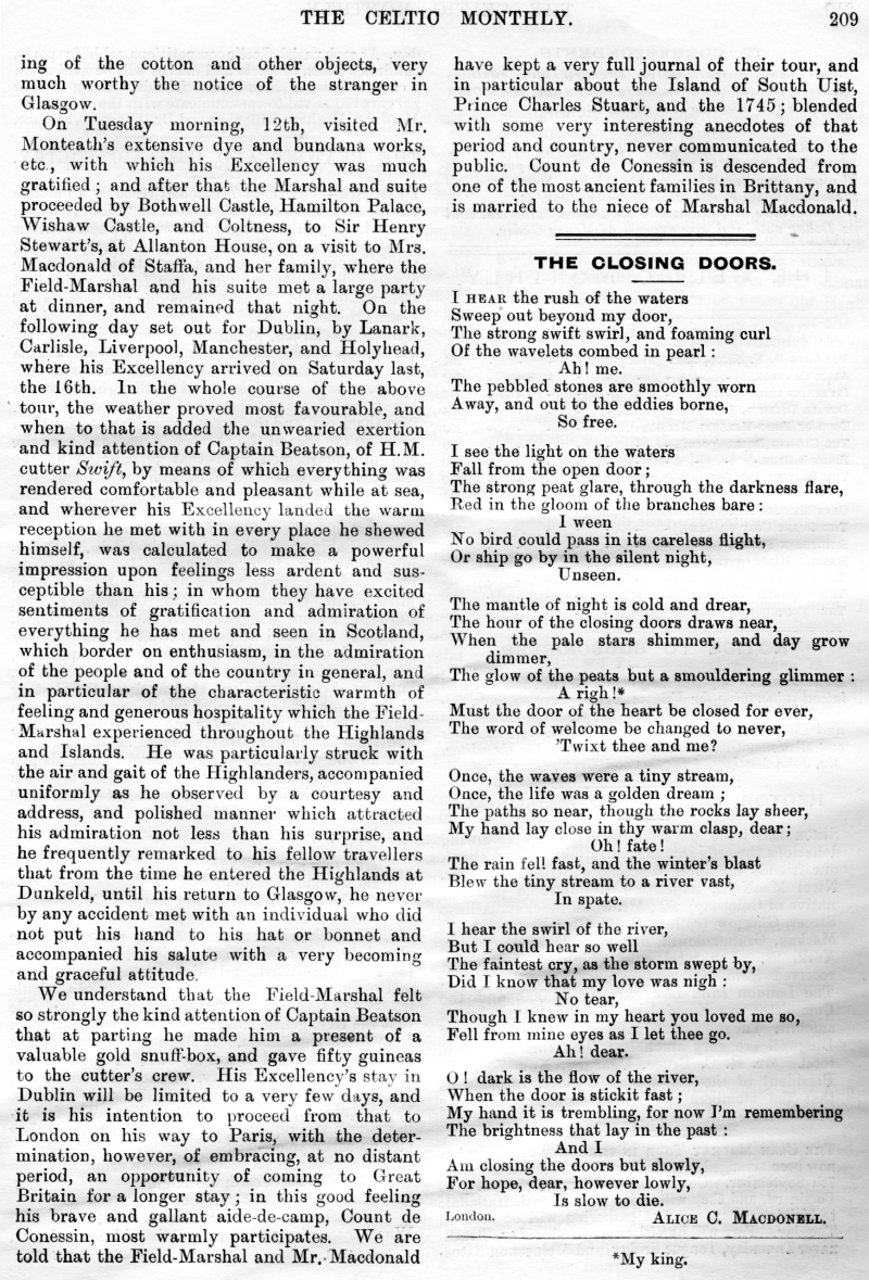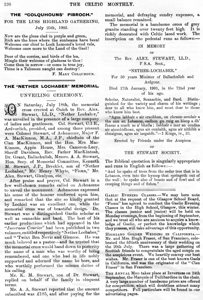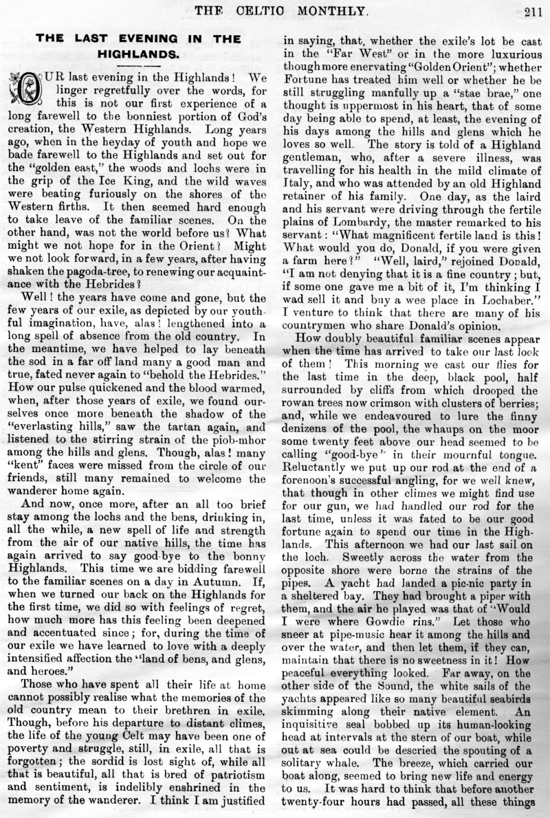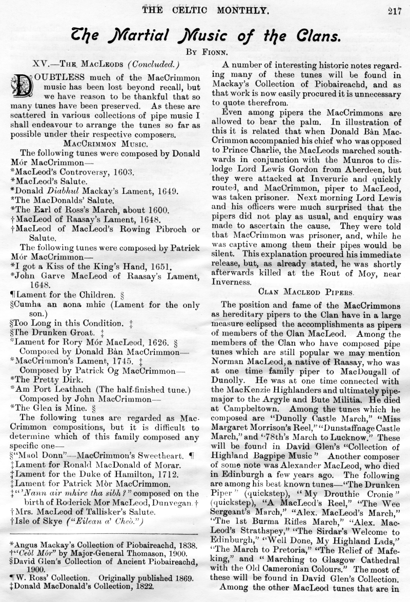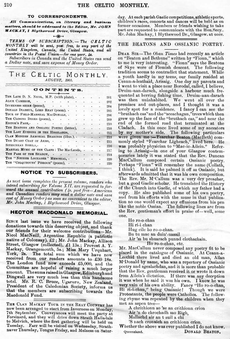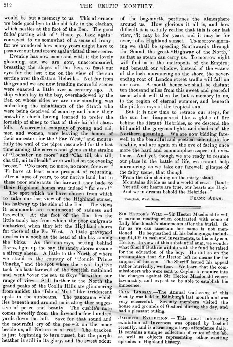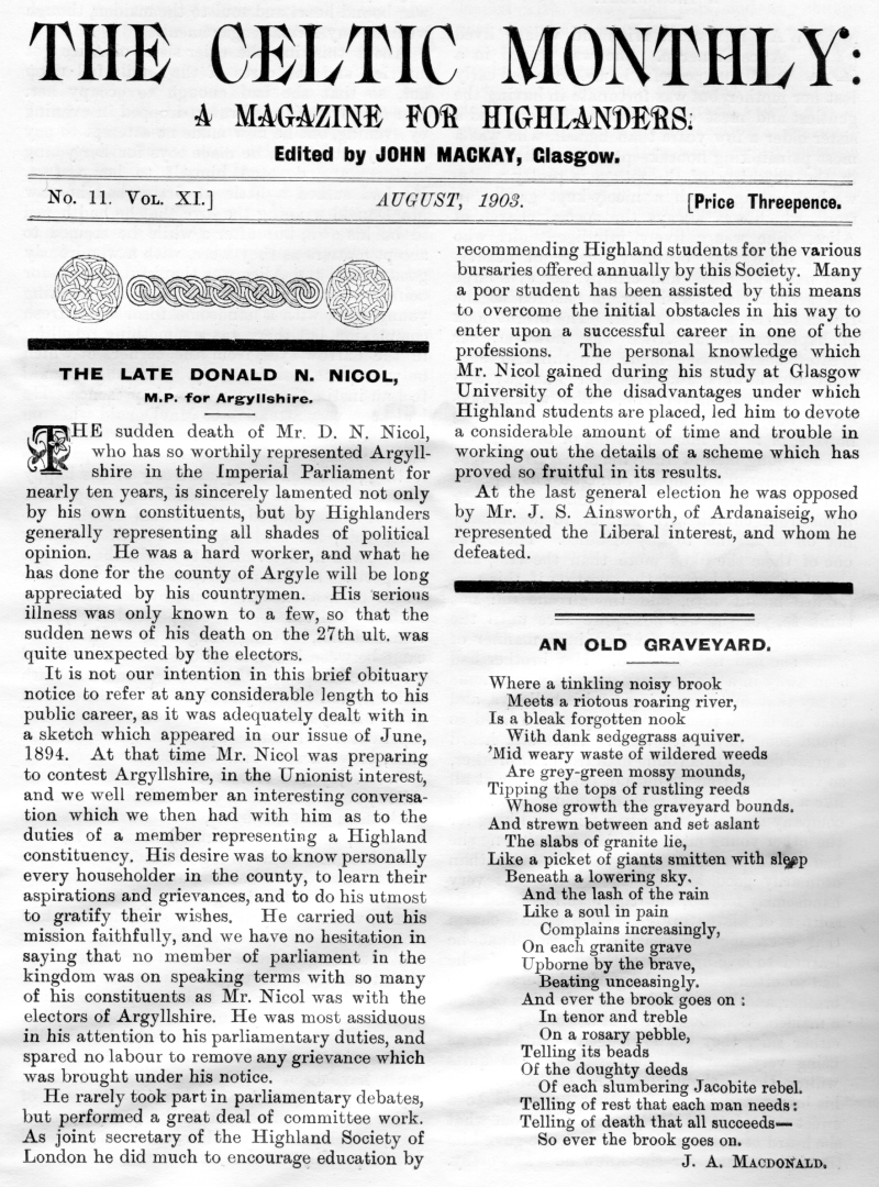 The Late Donald N Nicol, An Old Graveyard, Alice Cameron, Inverness-Shire, Legends of the Clan MacKay, Tour of His Excellency Field Marshall MacDonald, The Closing Doors, The Last Evening in the Highlands, Clan Menzies Armorial Bearings, The Duart Coat of Arms, Sithichean Shelia, The Martial Music of the Clans, The Pass of the Shadow, The "Colquhouns Peabroch", The "Nether Lochaber" Memorial.
