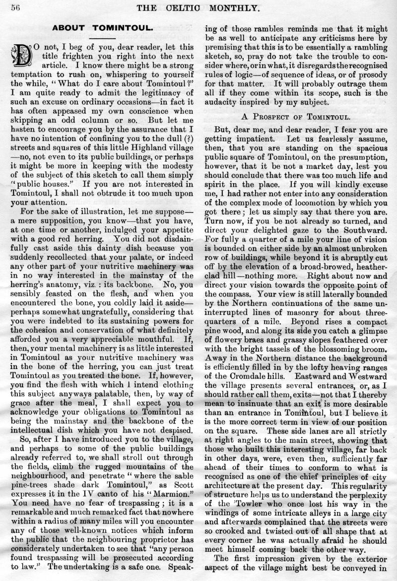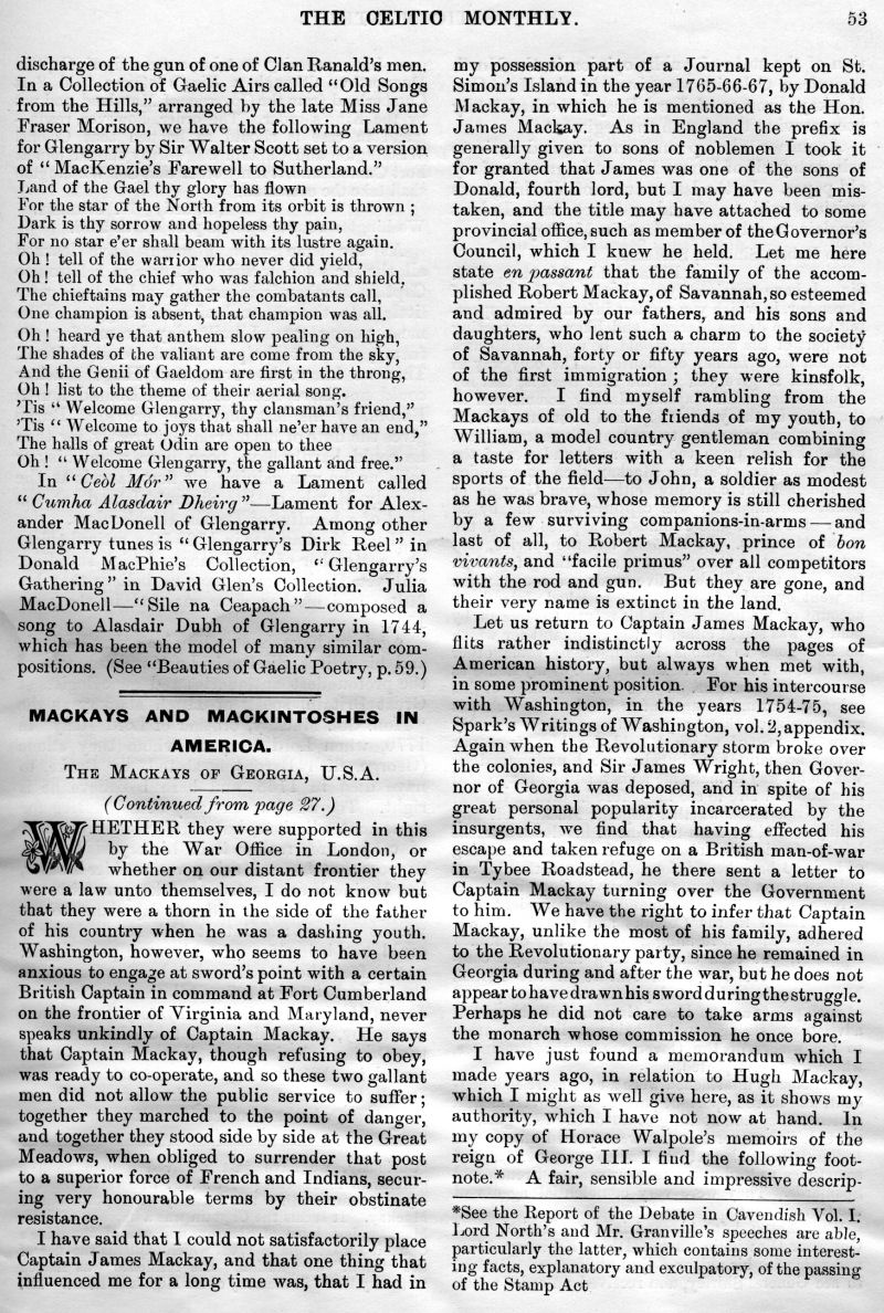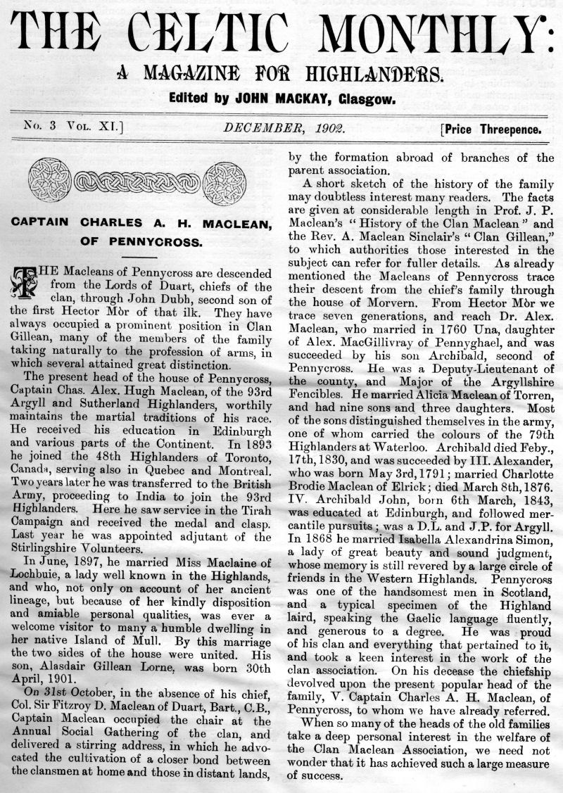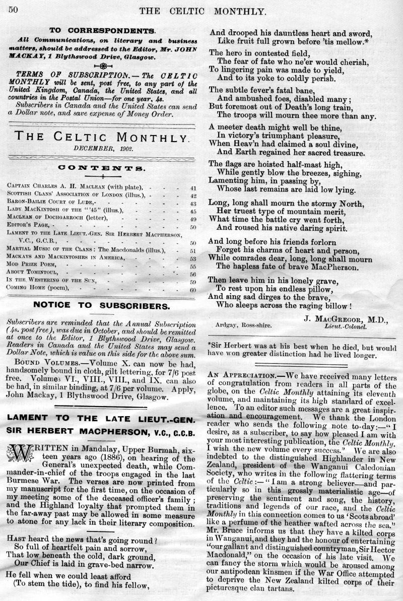 Captain Charles. H. MacLean, Scottish Clans Association of London, Lady MacKintosh of the '45, Lament to the Late Lieut-Gen. Sir Herbert MacPherson, The Martial Music of the Clans, MacKays and MacKintoshes in America, About Tomintoul, In the Westering of the Sun, Coming Home.
