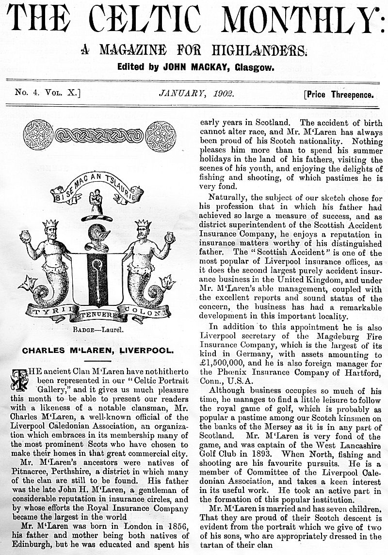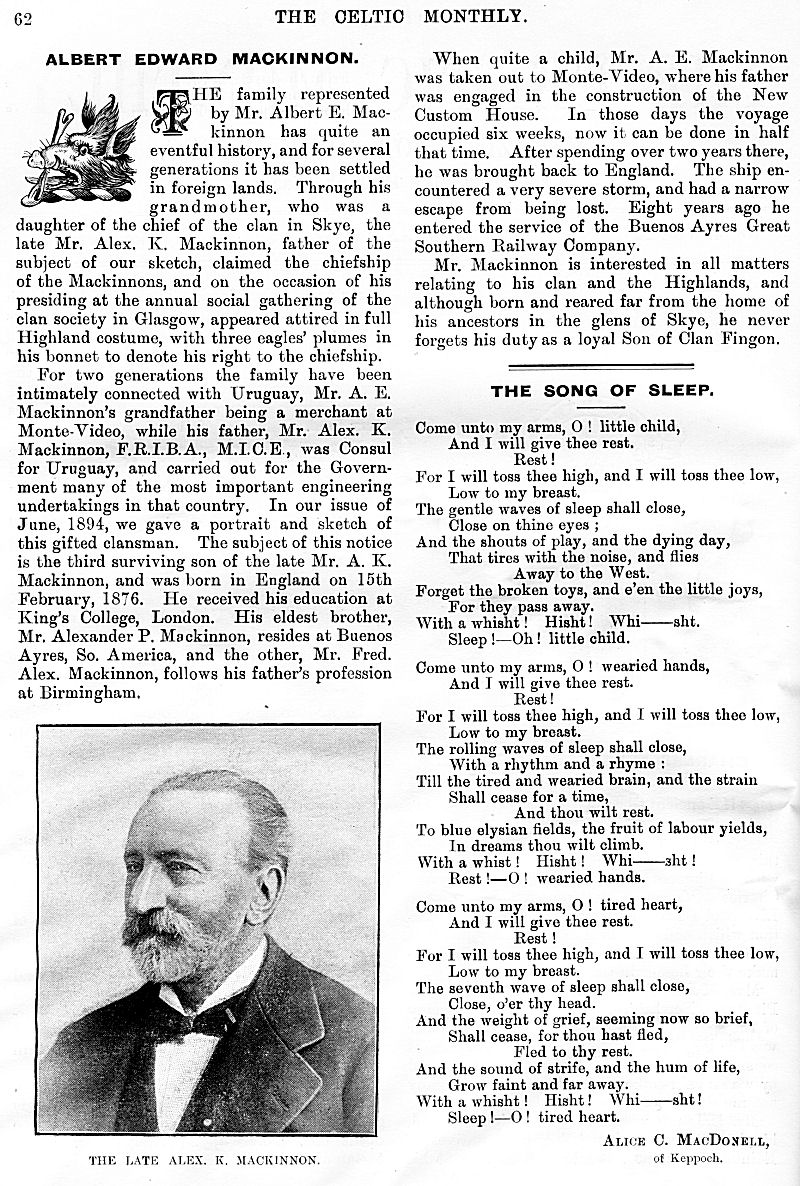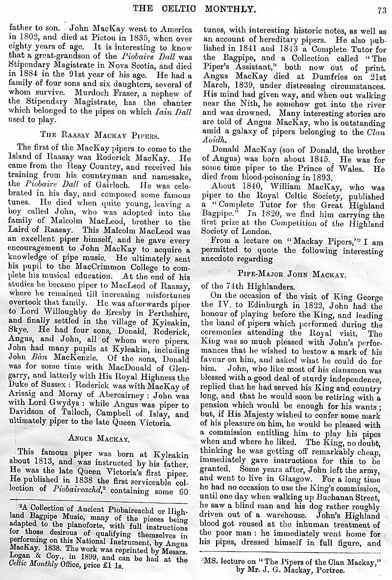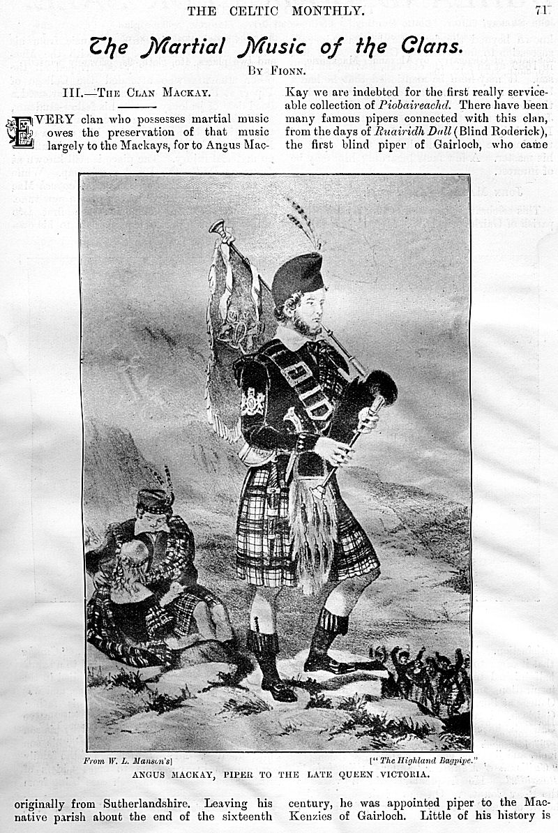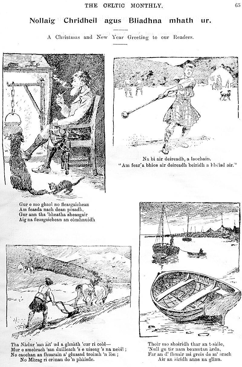 Charles M'Laren Liverpool, Albert Edward MacKinnon, The Song of Sleep, The Piper of Golf and Green, A Christmas and New Year Greeting, The Pledged Sporran, Clan Menzies Gathering, Martian Music of the Clans, The Marquis of Dufferin on the Races of Ireland, Gaelic Music in Scotland, Rognvald: Earl, Jorsala-Farer and Saint.
