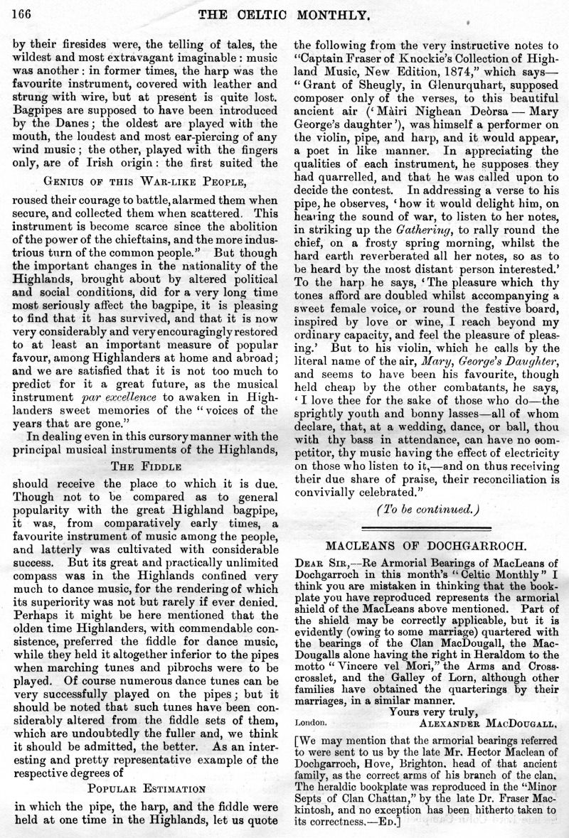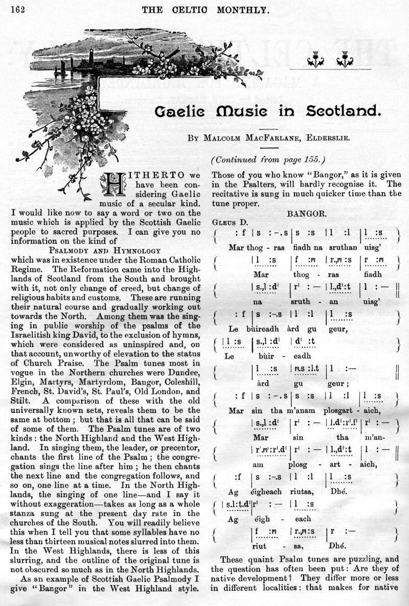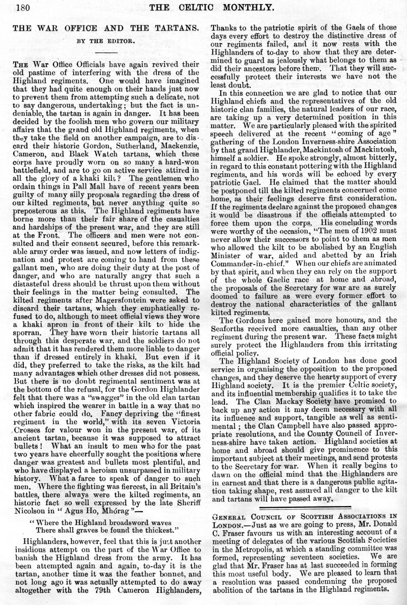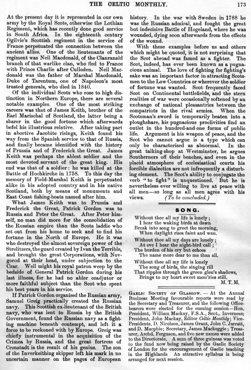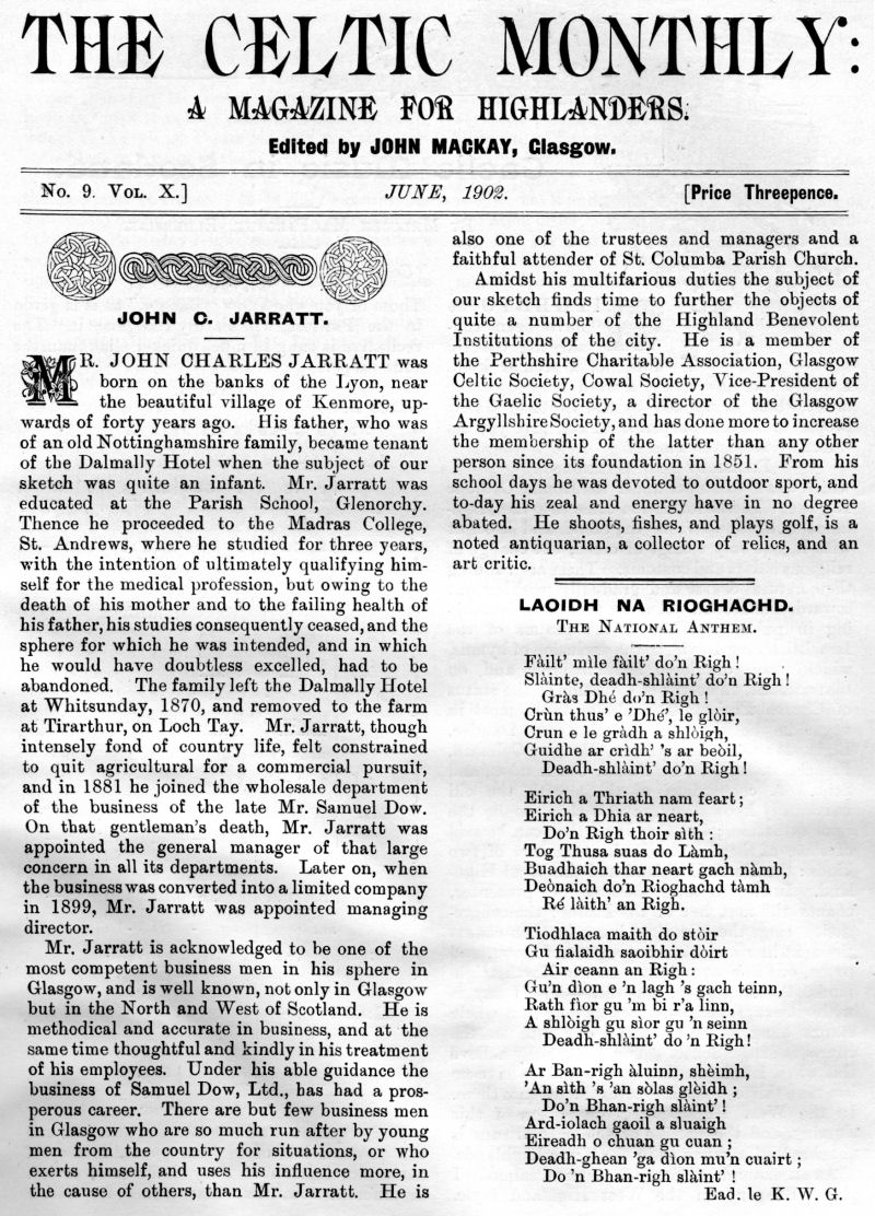 John G. Jarratt, Laoidh na Rioghachd (The National Anthem), Gaelic Music in Scotland, Highland Scenery and Climate in Relation to National Music and Poetry, The Martial Music of the Clans, Leaving the Glen, What is my Tartan?, The Scot Abroad, The Story of Jane MacRae, To a Bunch of Scotch Heather, The Early Celtic Church, London Argyllshire Association, Unitas Celtica, The War Office and the Tartans.