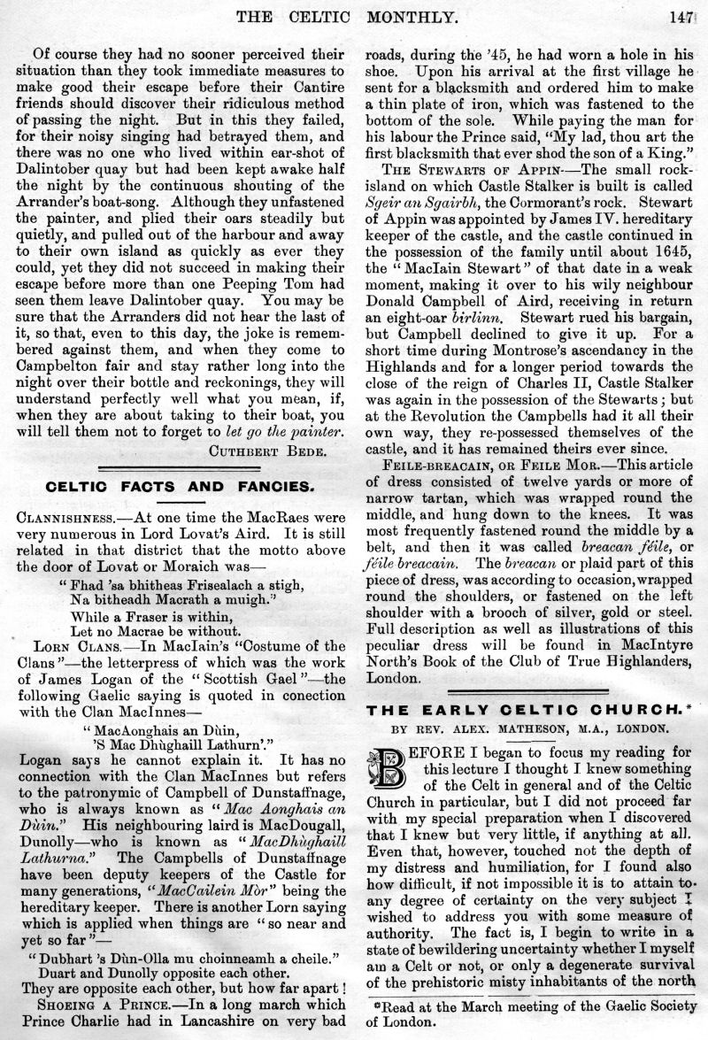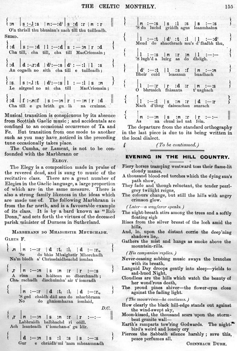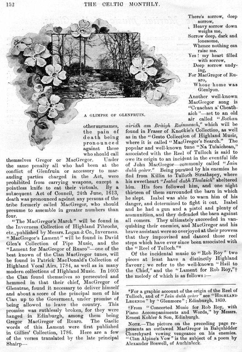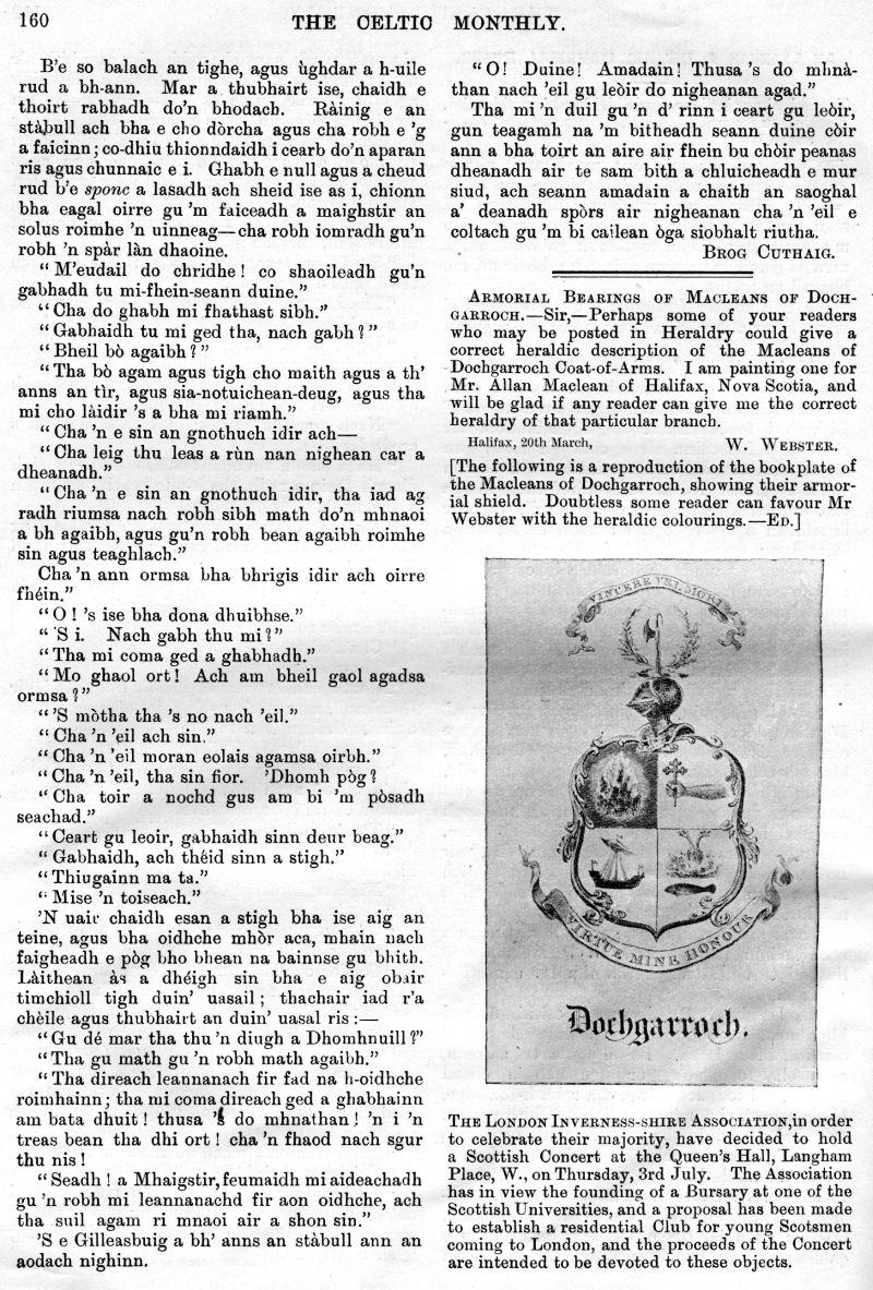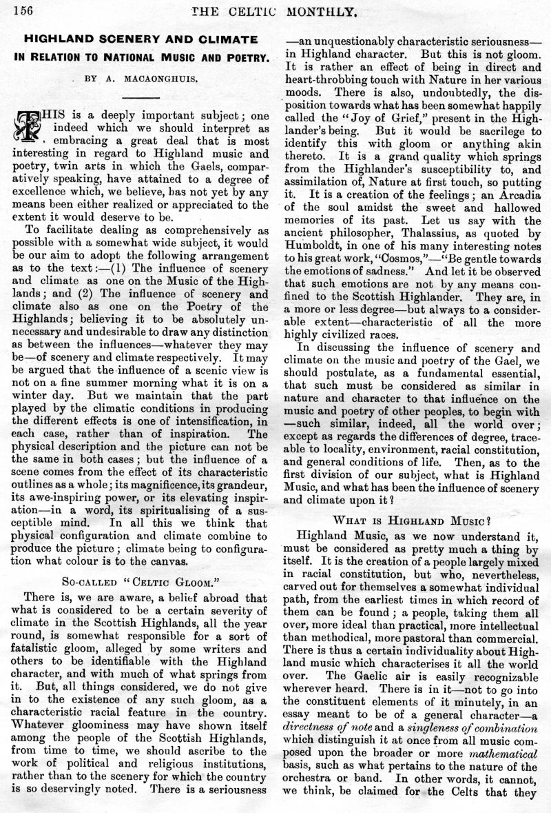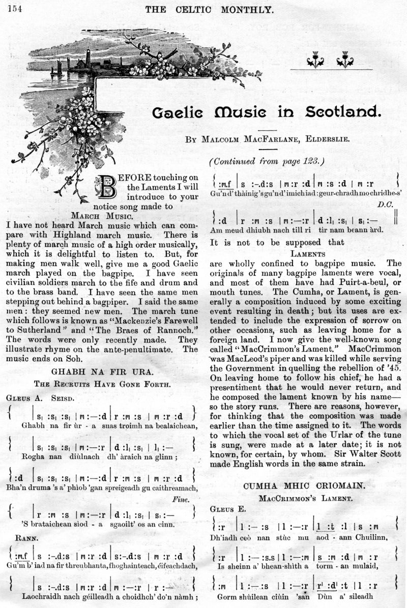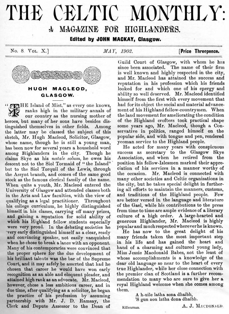 Hugh MacLeod of Glasgow, Scottish Memories in the Midlands, Stories of Kintyre, Celtic Facts and Fancies, The Early Celtic Church, The Highland Hills, The Martial Music of the Clans, Gaelic Music in Scotland, Evening in the Hill Country, Highland Scenery and Climate in Relation to National Music and Poetry, Bonnie Prince Charlie, An Leannan A Bh' Aig Domhnull Ruadh, Armorial Bearings of MacLeans of Dochharroch.